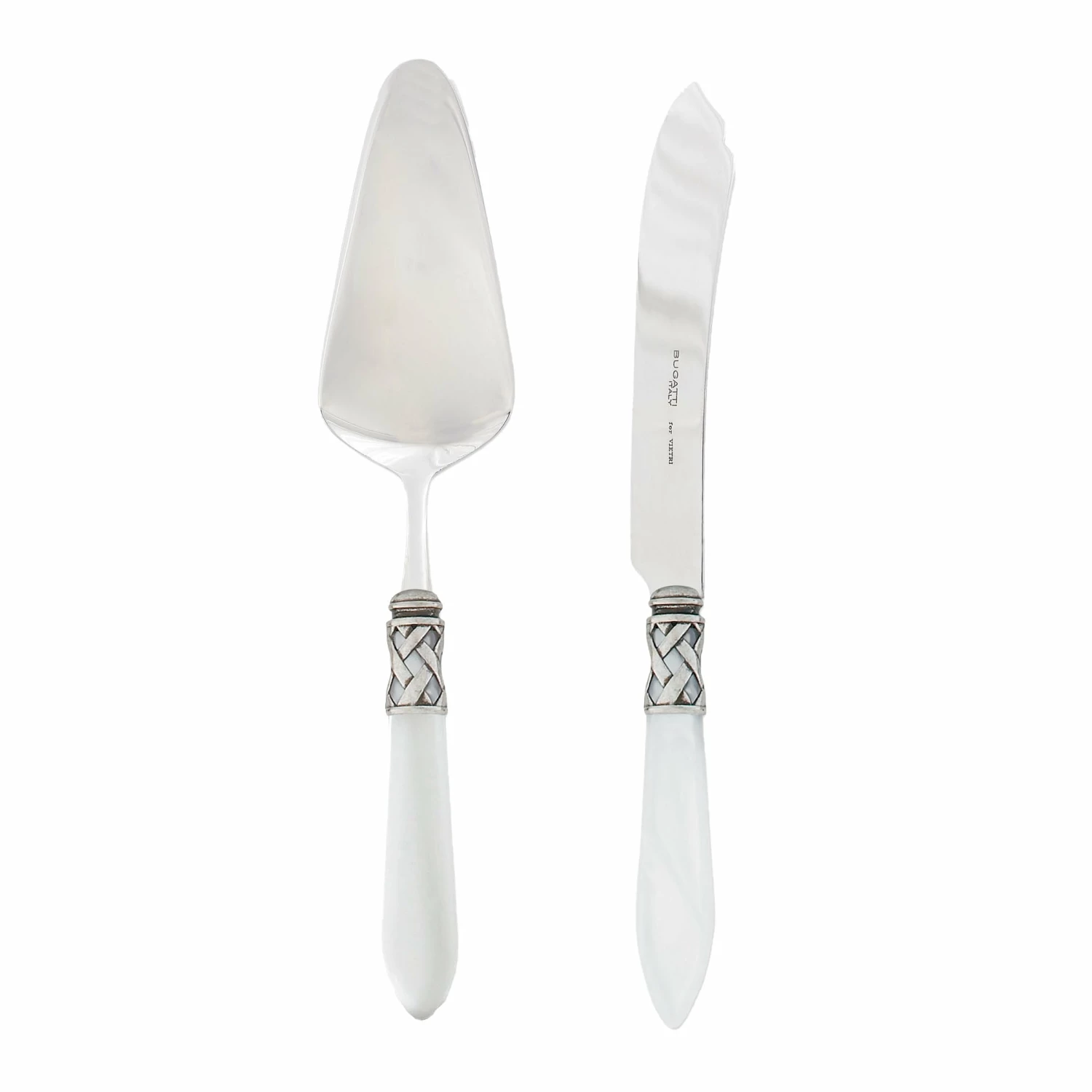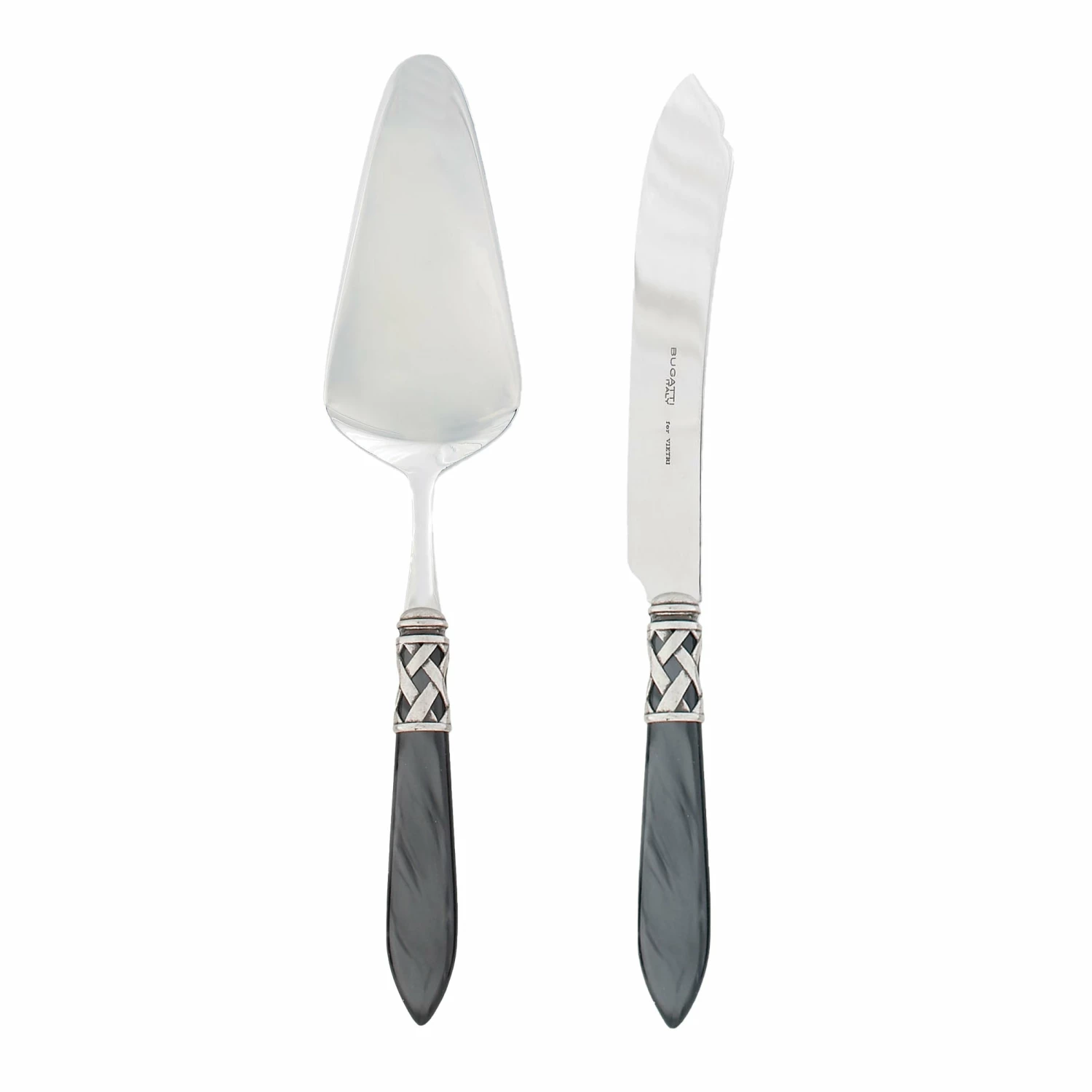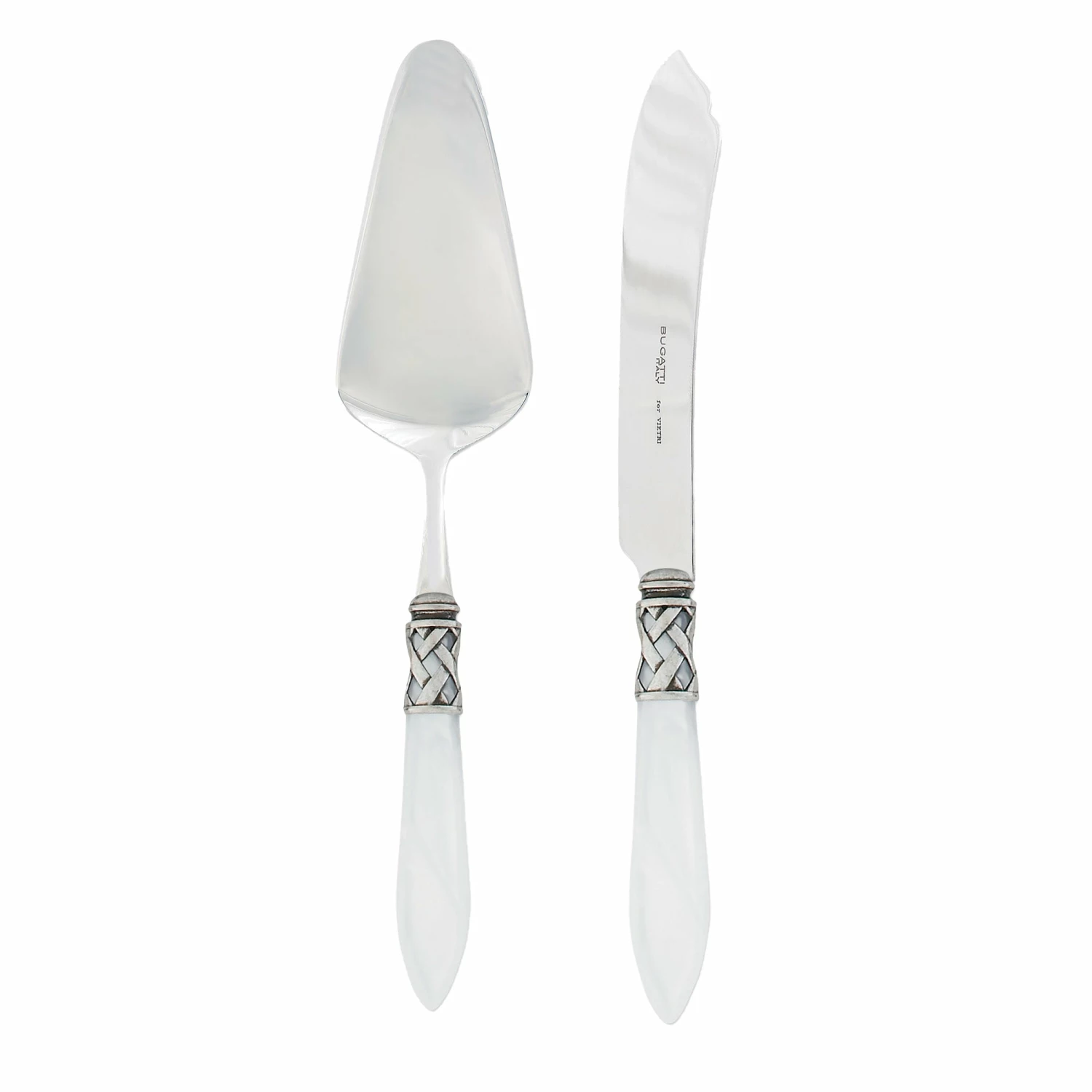The Aladdin Antique Dessert Set is made of 18/10 stainless steel in Italy and includes the Aladdin Pastry Server and Cake Knife.