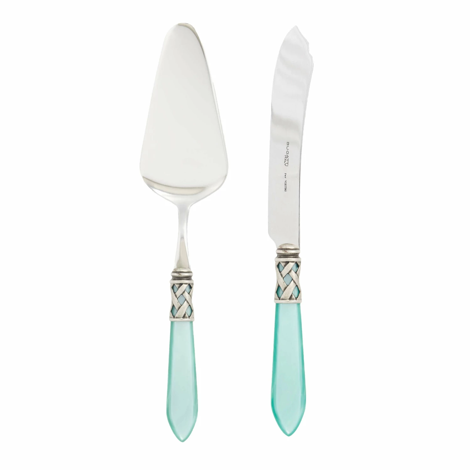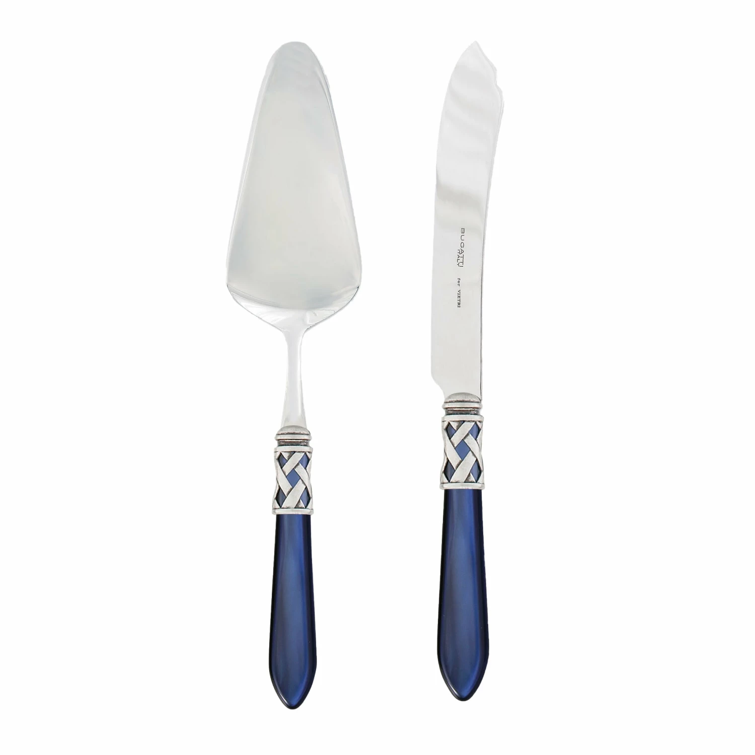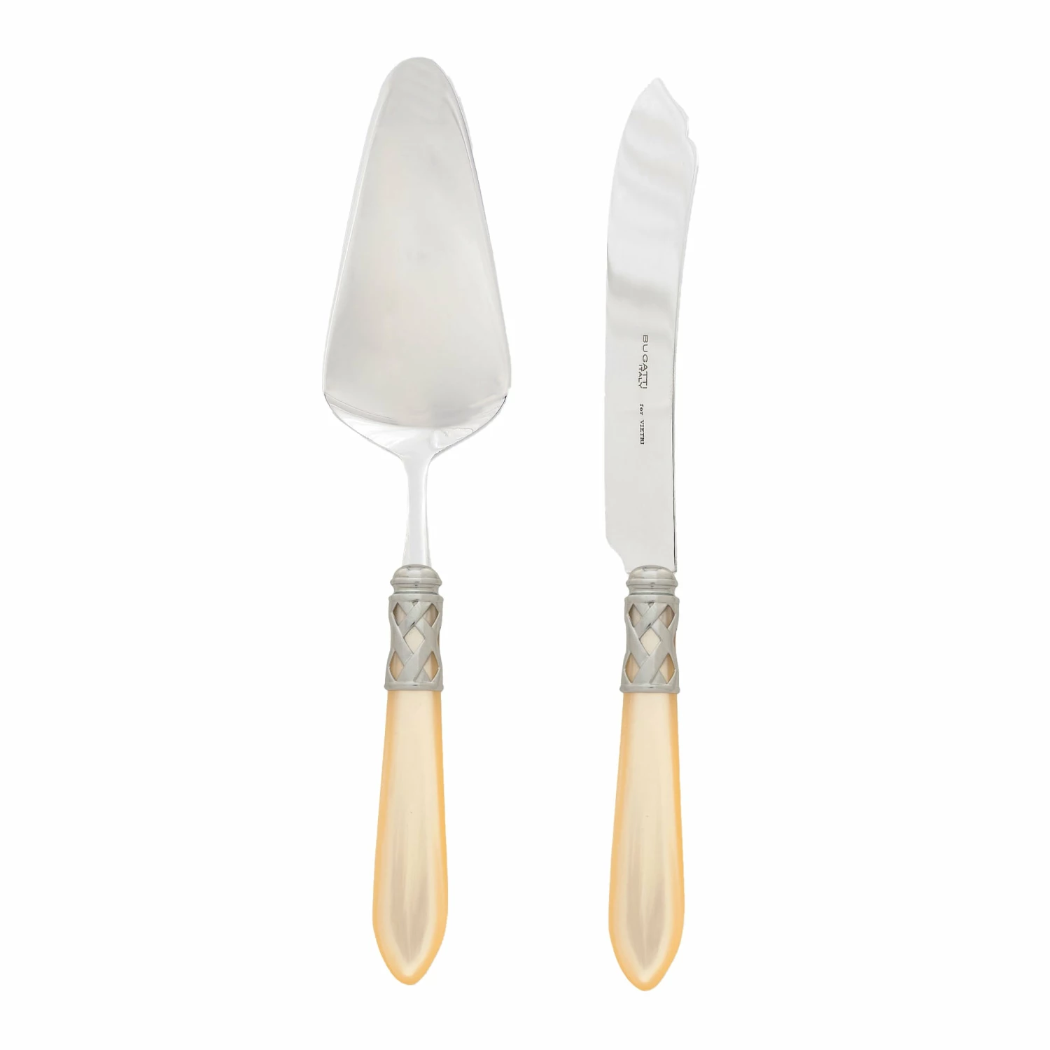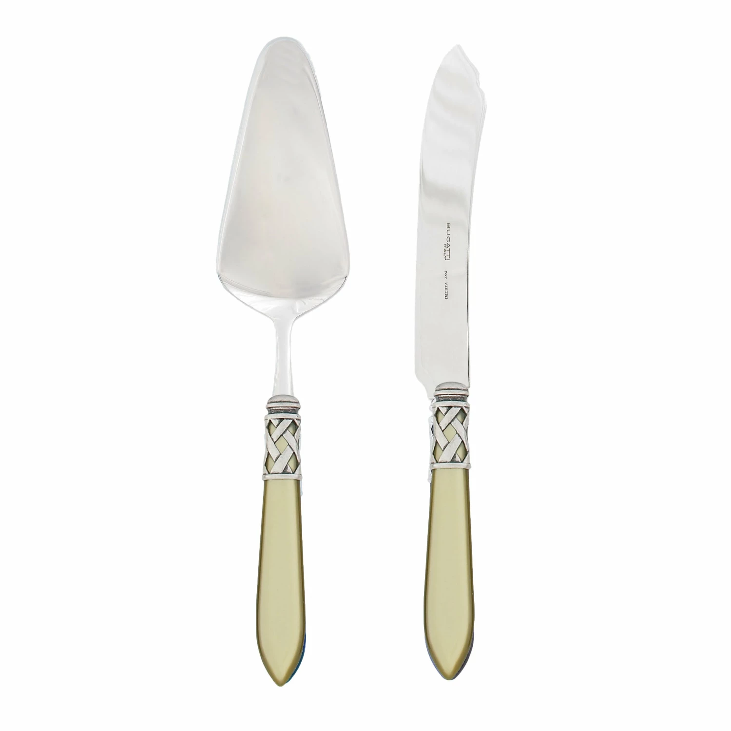 The Aladdin Antique Dessert Set is made of 18/10 stainless steel in Italy and includes the Aladdin Pastry Server and Cake Knife.
