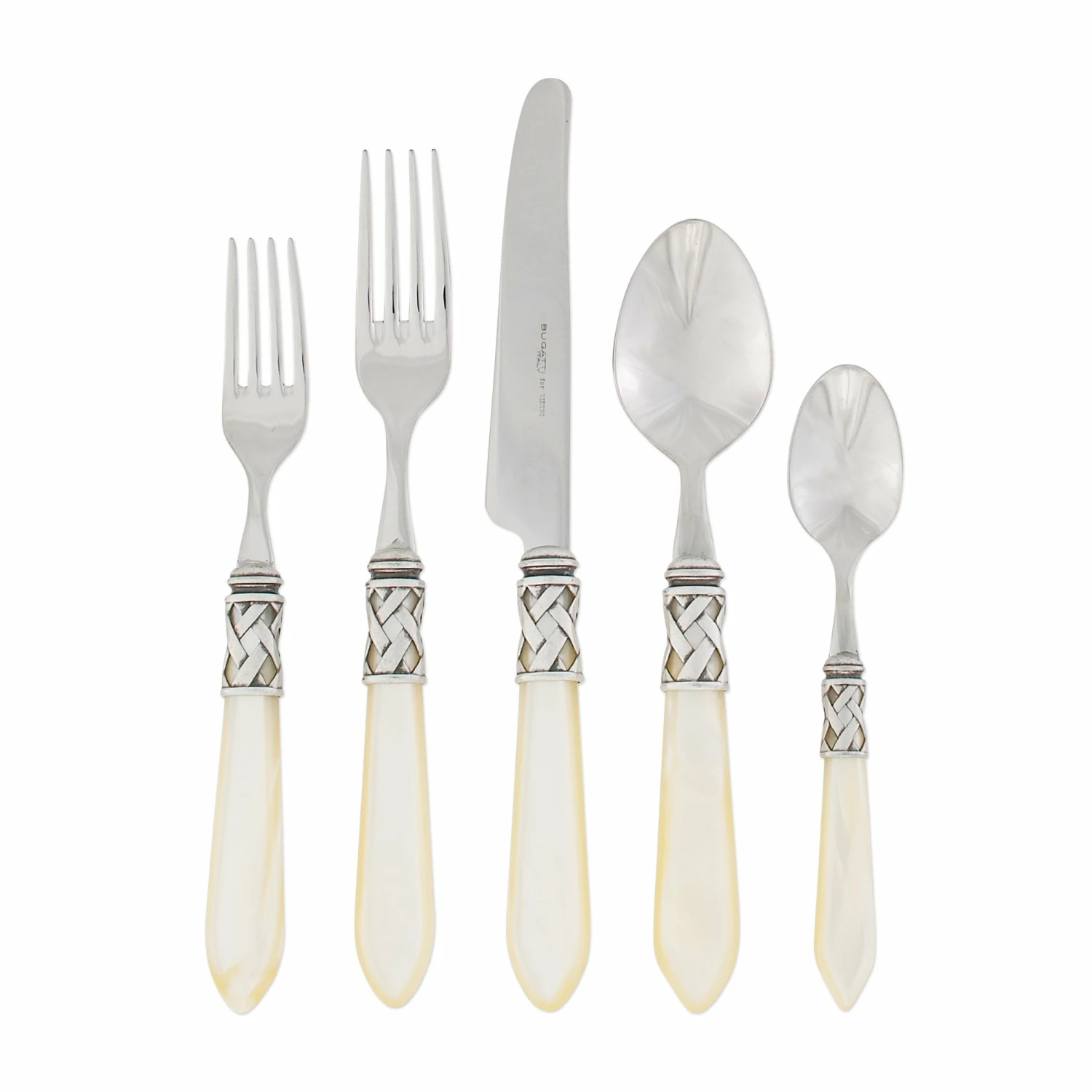 The Aladdin Ivory Antique Five-Piece Place Setting features elegant pearlized handles with the strength of high-grade acrylic and 18/10 stainless steel. Our most popular color, it looks great with all dinnerware!
