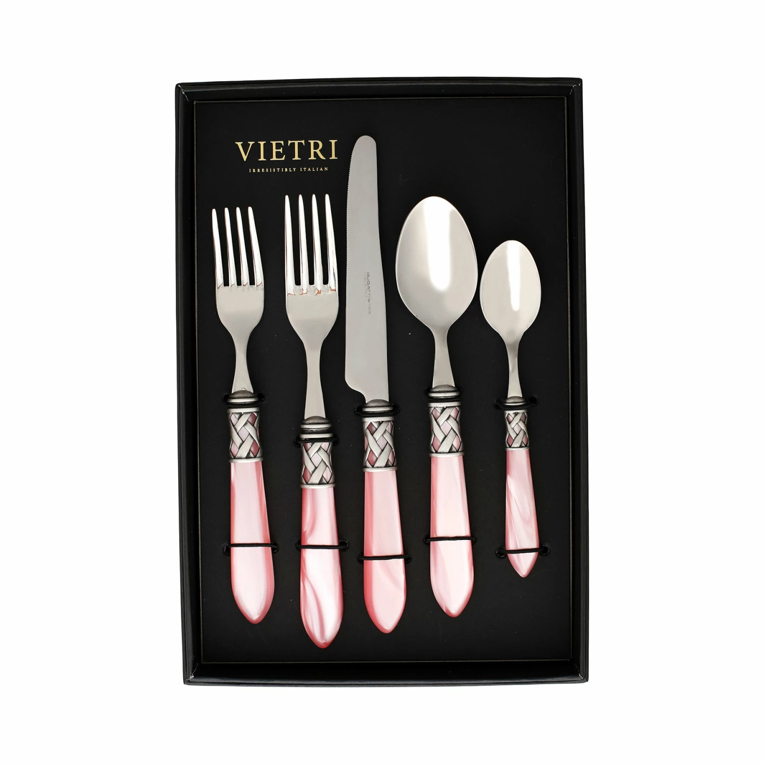The Aladdin Antique Five-Piece Place Setting (Set of 4) features elegant pearlized handles with the strength of high-grade acrylic and 18/10 stainless steel. The handles are wrapped with intricate lattice metalwork.