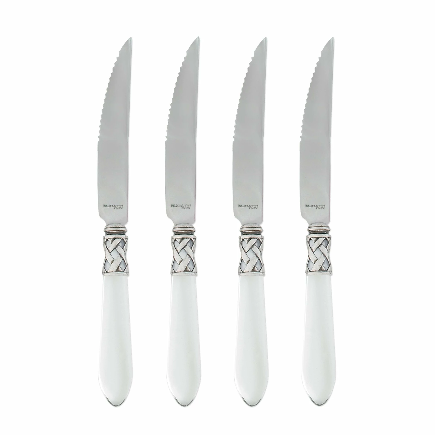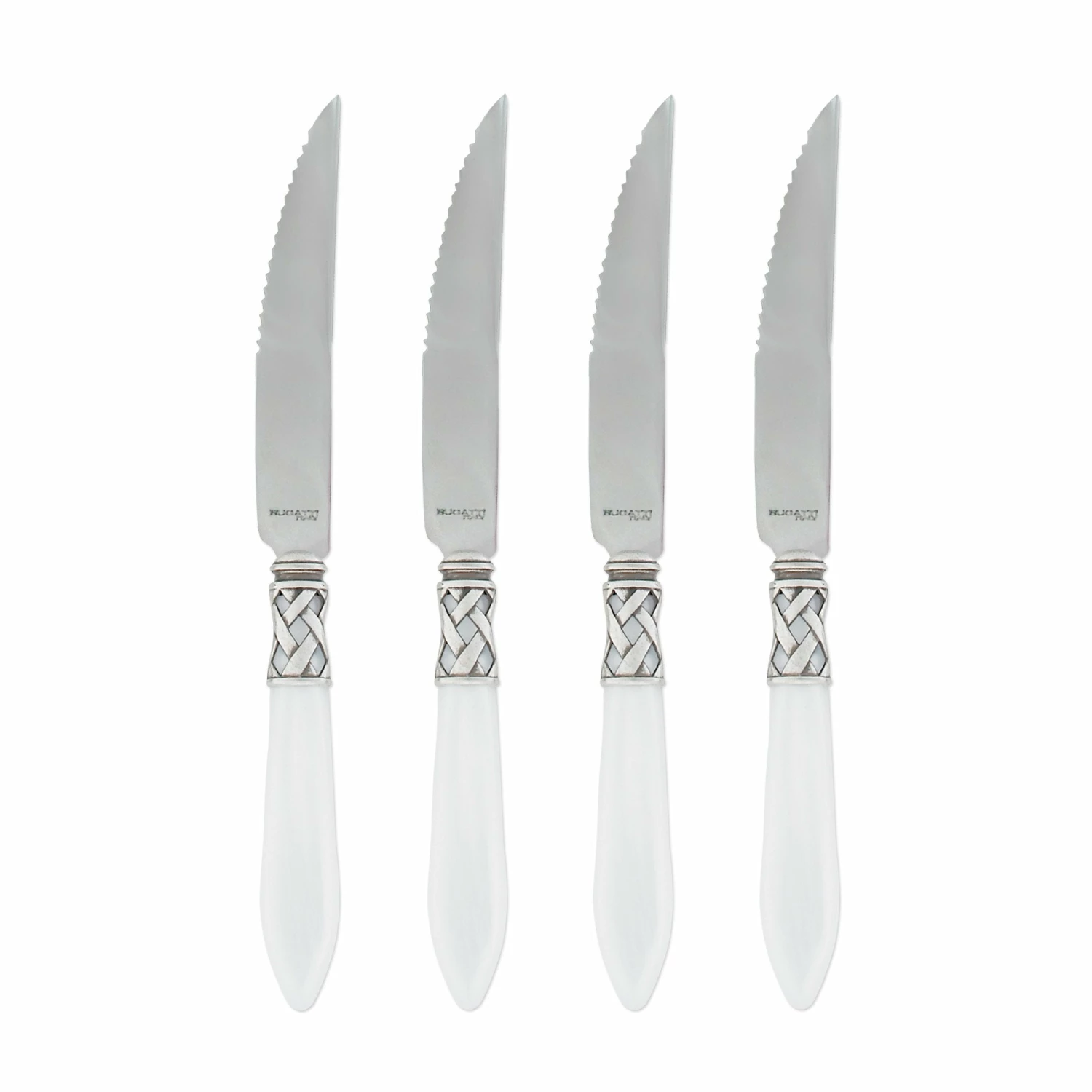 The Aladdin Antique Steak Knives feature elegant pearlized handles with the strength of high-grade acrylic and 18/10 stainless steel. This piece is also available in our brilliant finish.
