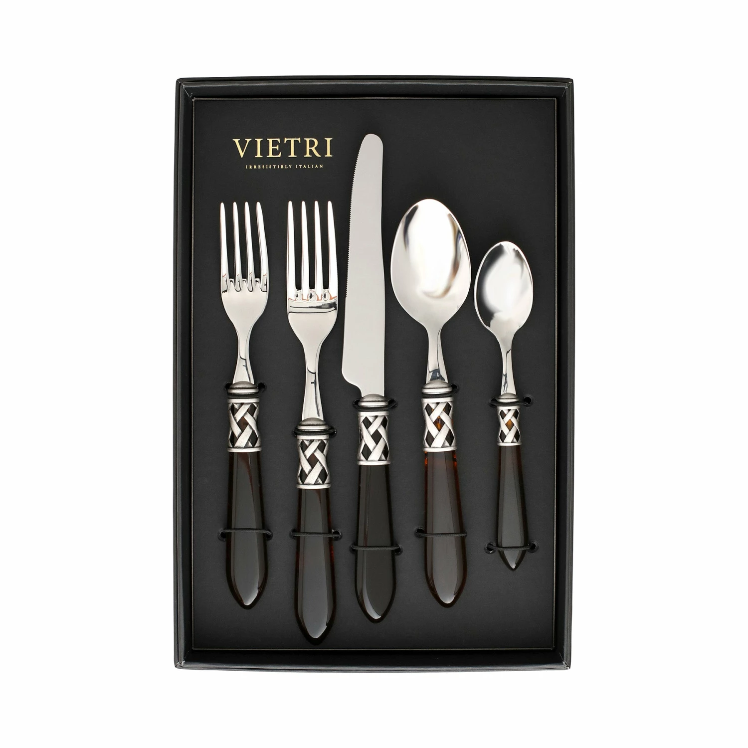 The Aladdin Antique Five-Piece Place Setting (Set of 4) features elegant pearlized handles with the strength of high-grade acrylic and 18/10 stainless steel. The handles are wrapped with intricate lattice metalwork.