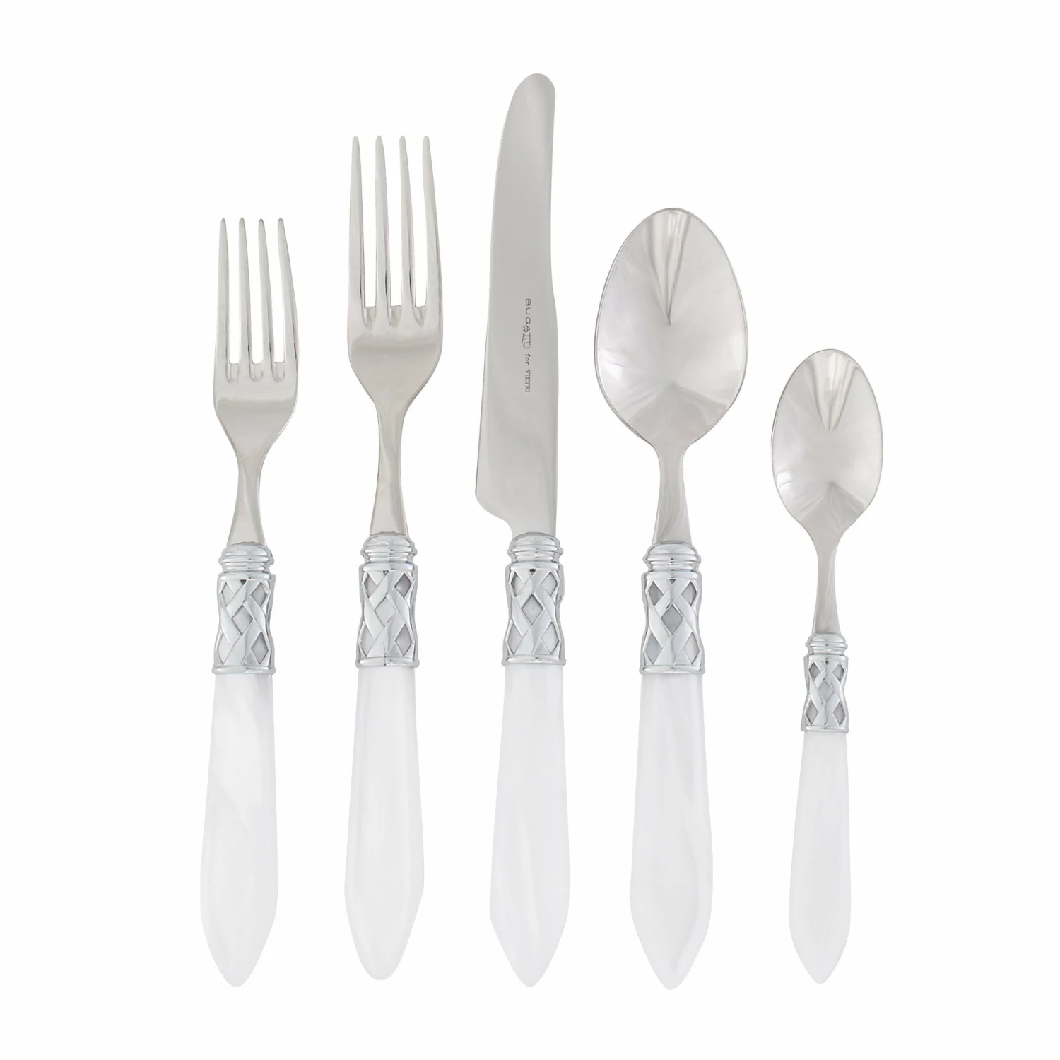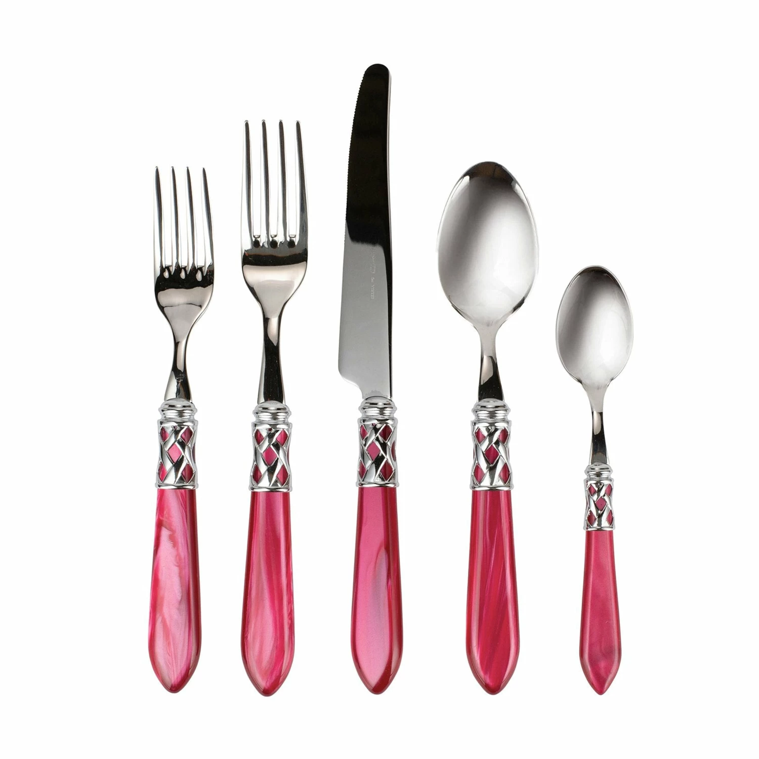 The Aladdin Brilliant Five-Piece Place Setting features elegant pearlized handles with the strength of high-grade acrylic and 18/10 stainless steel. The brilliant finish on the handle has a sophisticated, updated look.