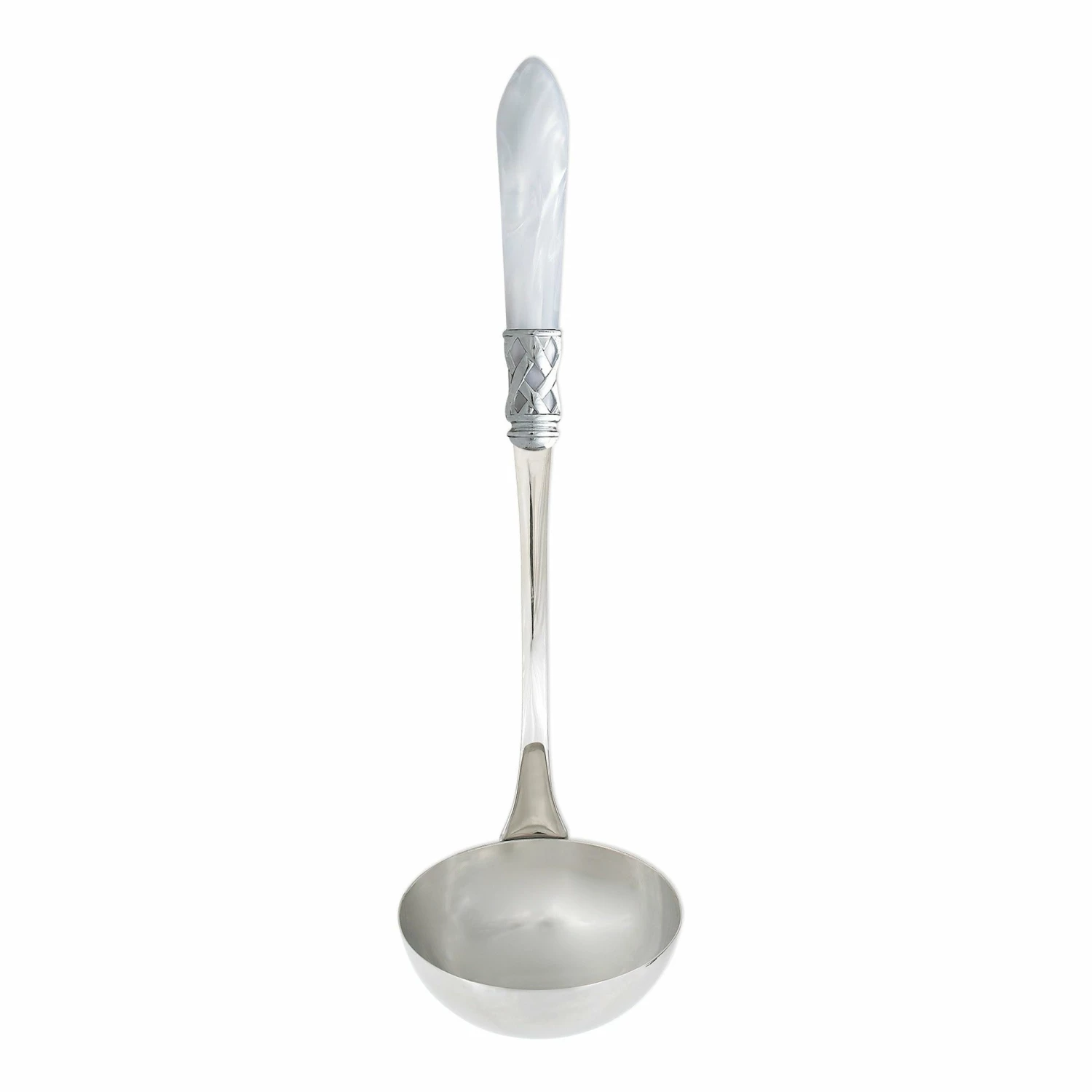The Aladdin Brilliant Soup Ladle features elegant pearlized handles with the strength of high-grade acrylic and 18/10 stainless steel. This piece is also available in our antique finish.