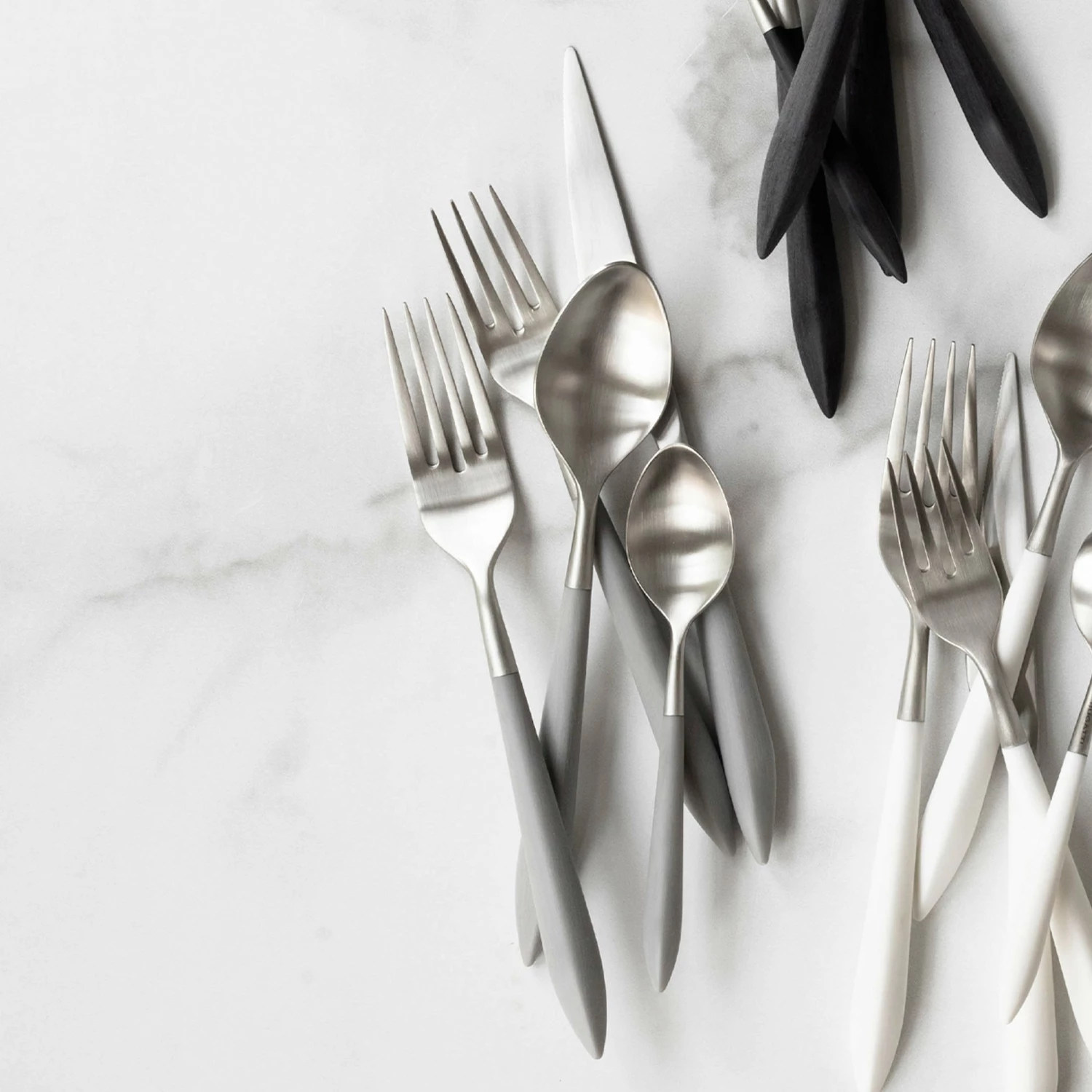 The contemporary matte handle found on the Ares Argento & Light Gray Five-Piece Place Setting provides perfect balance and weight for a luxury flatware experience. Argento, the brushed silver, finishes off the utensil in 18/10 stainless steel.