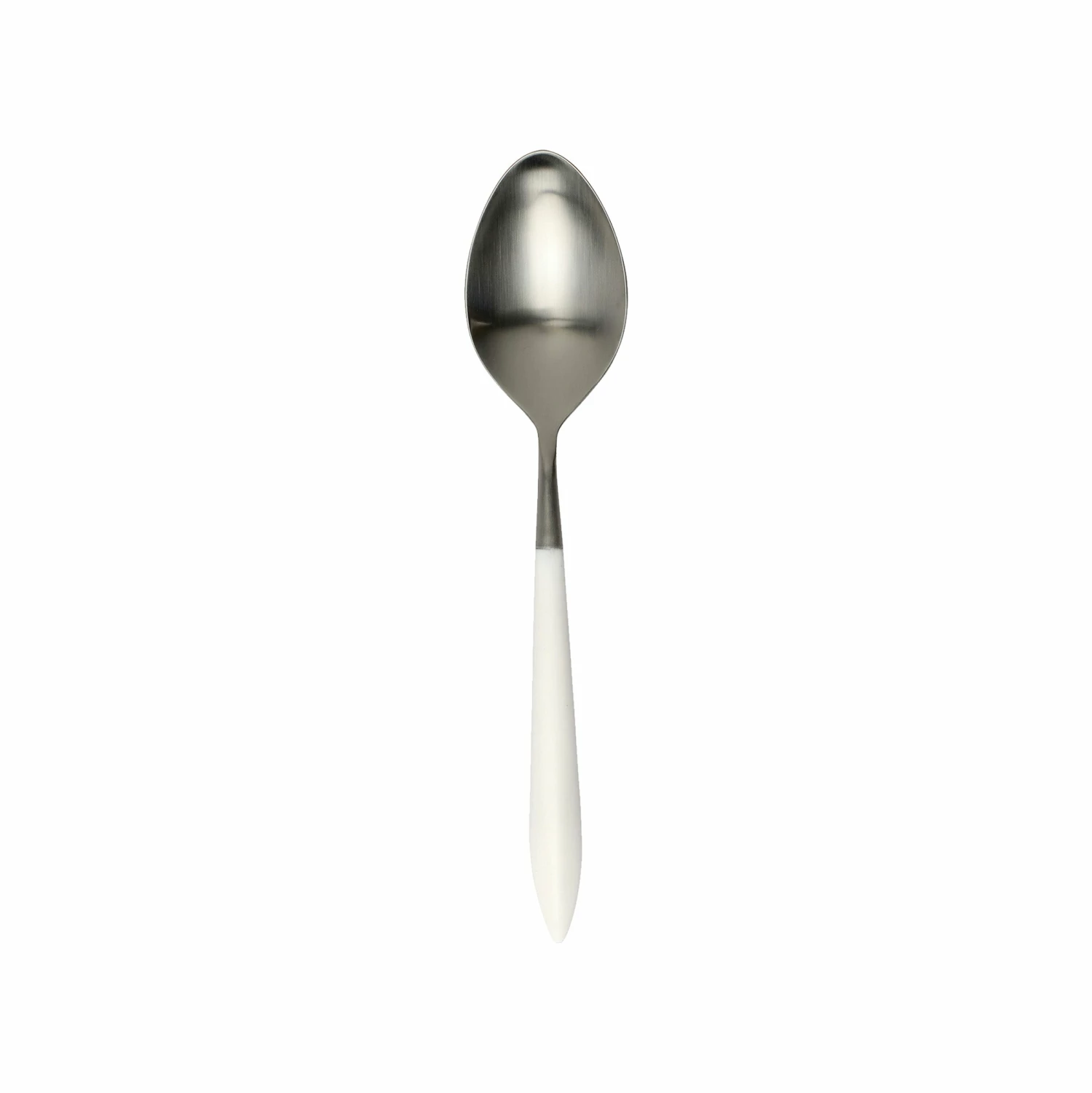 The contemporary matte handle found on the Ares Argento & White Serving Spoon provides perfect balance and weight for a luxury flatware experience. Argento, the brushed silver, finishes off the utensil in 18/10 stainless steel.