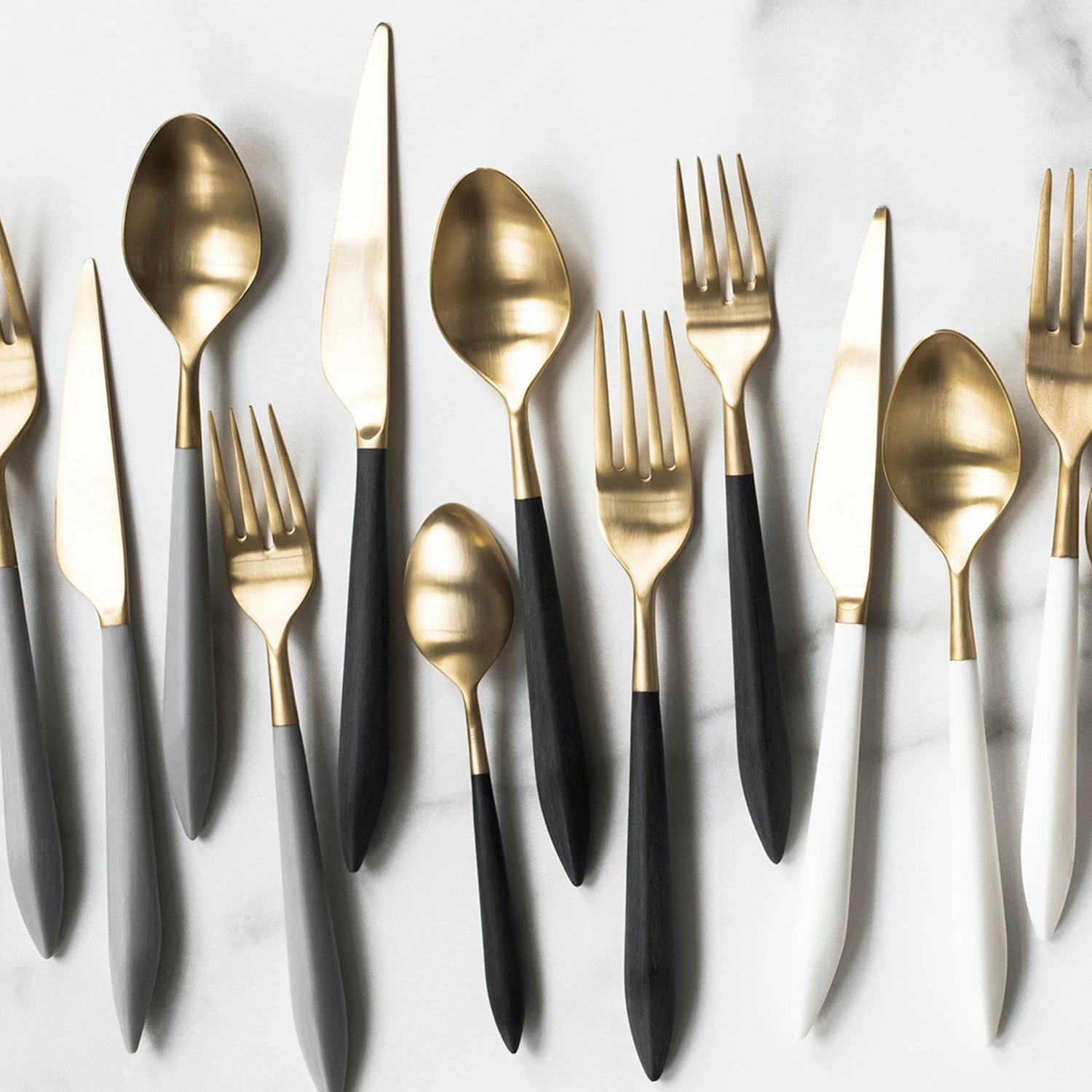 The contemporary matte handle found on the Ares Oro & Black Five-Piece Place Setting provides perfect balance and weight for a luxury flatware experience. Oro, the brushed gold, finishes off the utensil in 18/10 stainless steel.