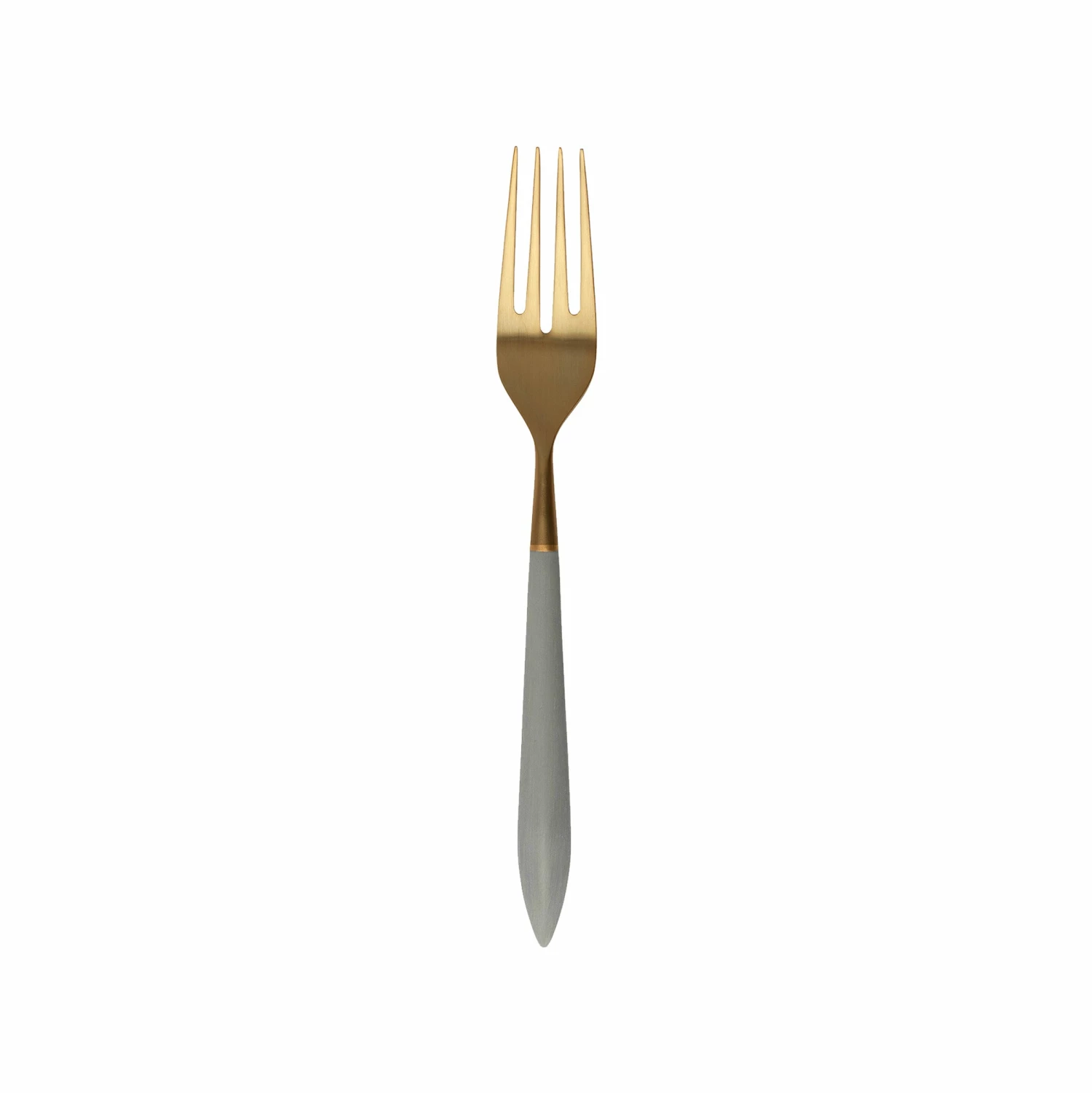 The contemporary matte handle found on the Ares Oro & Light Gray Serving Fork provides perfect balance and weight for a luxury flatware experience. Oro, the brushed gold, finishes off the utensil in 18/10 stainless steel.