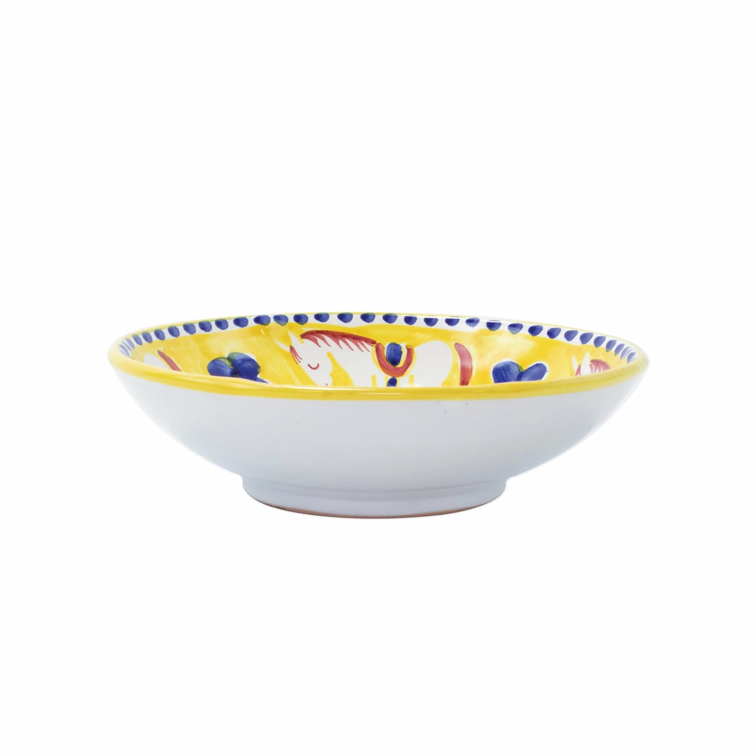 The colorful yellow and blue Campagna Cavallo Coupe Pasta Bowl features whimsical handpainted horses among beautiful wildflowers.