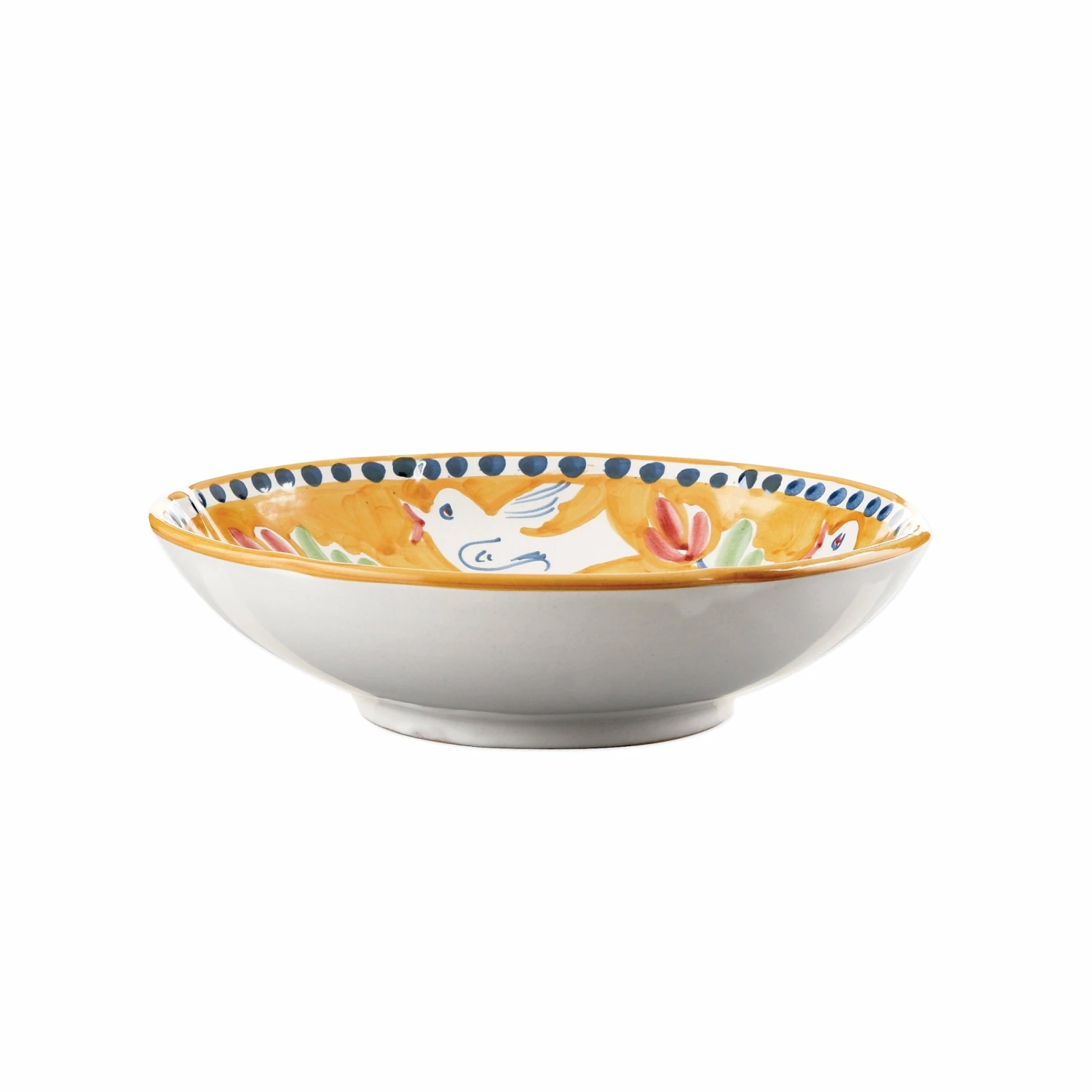 The colorful orange and blue Uccello Coupe Pasta Bowl features whimsical handpainted birds and flowers and is part of our flagship dinnerware collection, Campagna. Mix with other animals from the Campagna collection to create a fun table that captures the vitality of the Italian countryside!
