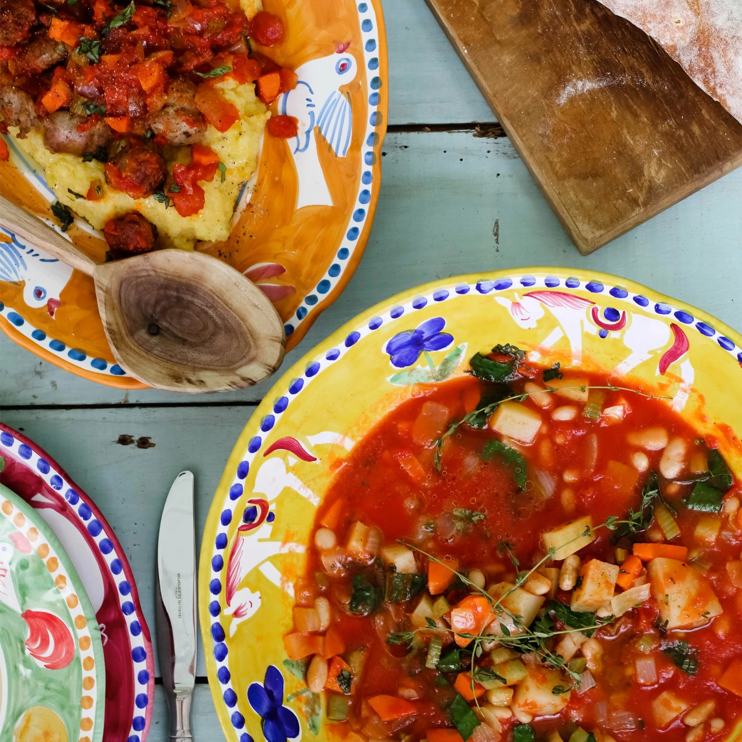 The colorful orange and blue Campagna Uccello Oval Platter features whimsical handpainted birds and flowers. Mix with other animals from the Campagna collection to create a fun table that captures the vitality of the Italian countryside!