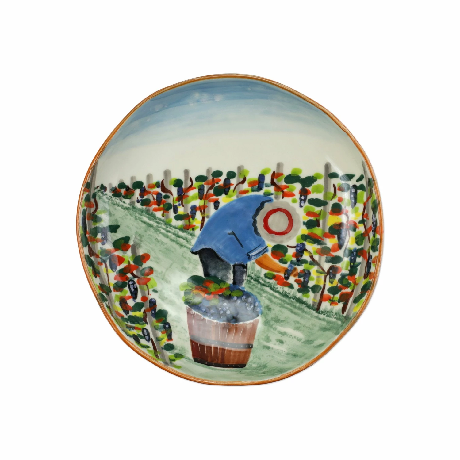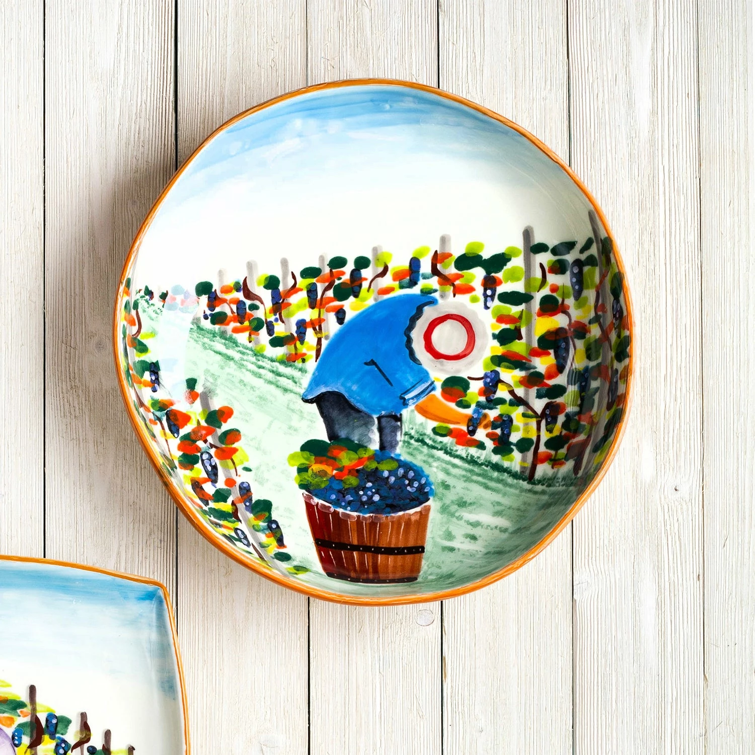 The harvesting of grapes to make wine, a long sought after tradition in Italy, is beautifully reflected in the handpainted Cantina Shallow Bowl.