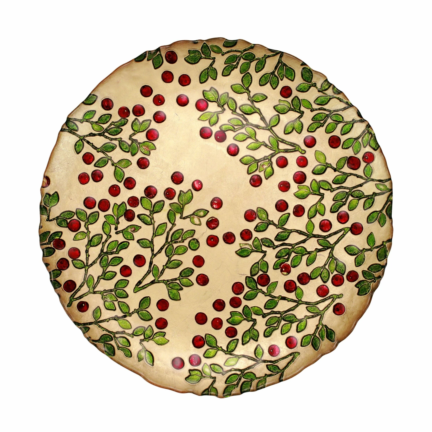 The traditional holiday berry adds elegance in gilded gold glass with accents of brilliant red and green on the Cranberry Glass Round Platter.