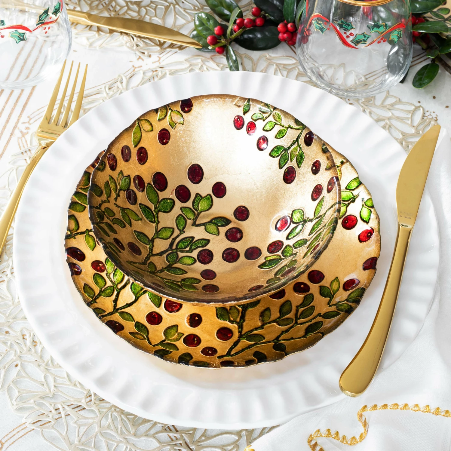 The traditional holiday berry adds elegance in gilded gold glass with accents of brilliant red and green on the Cranberry Glass Salad Plate.