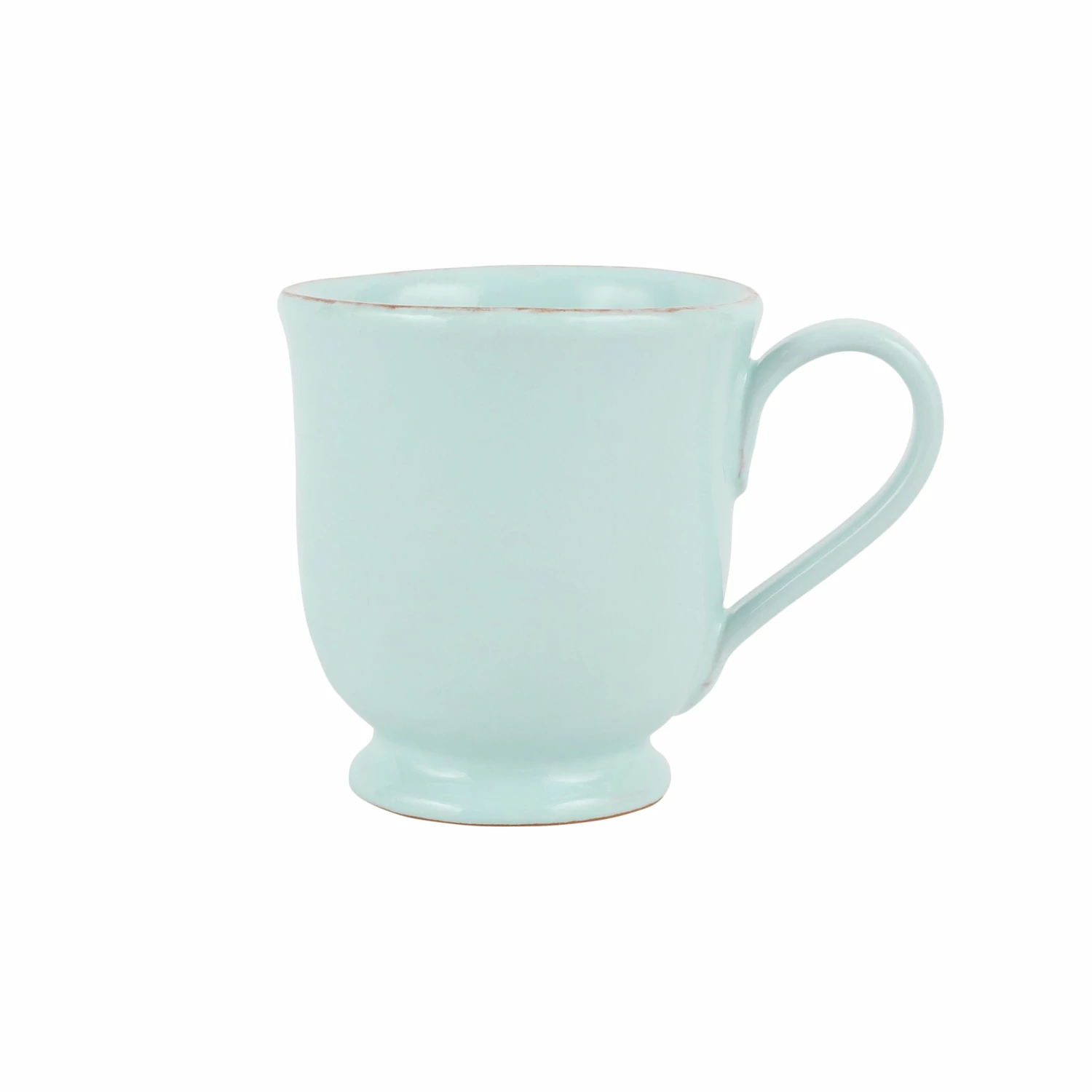 The Cucina Fresca Aqua Mug features raw terra cotta edges and a cool blue glaze reminiscent of the expansive Tuscan sky. The collection was inspired by the rustic, simple pottery of 14th-century Italy.