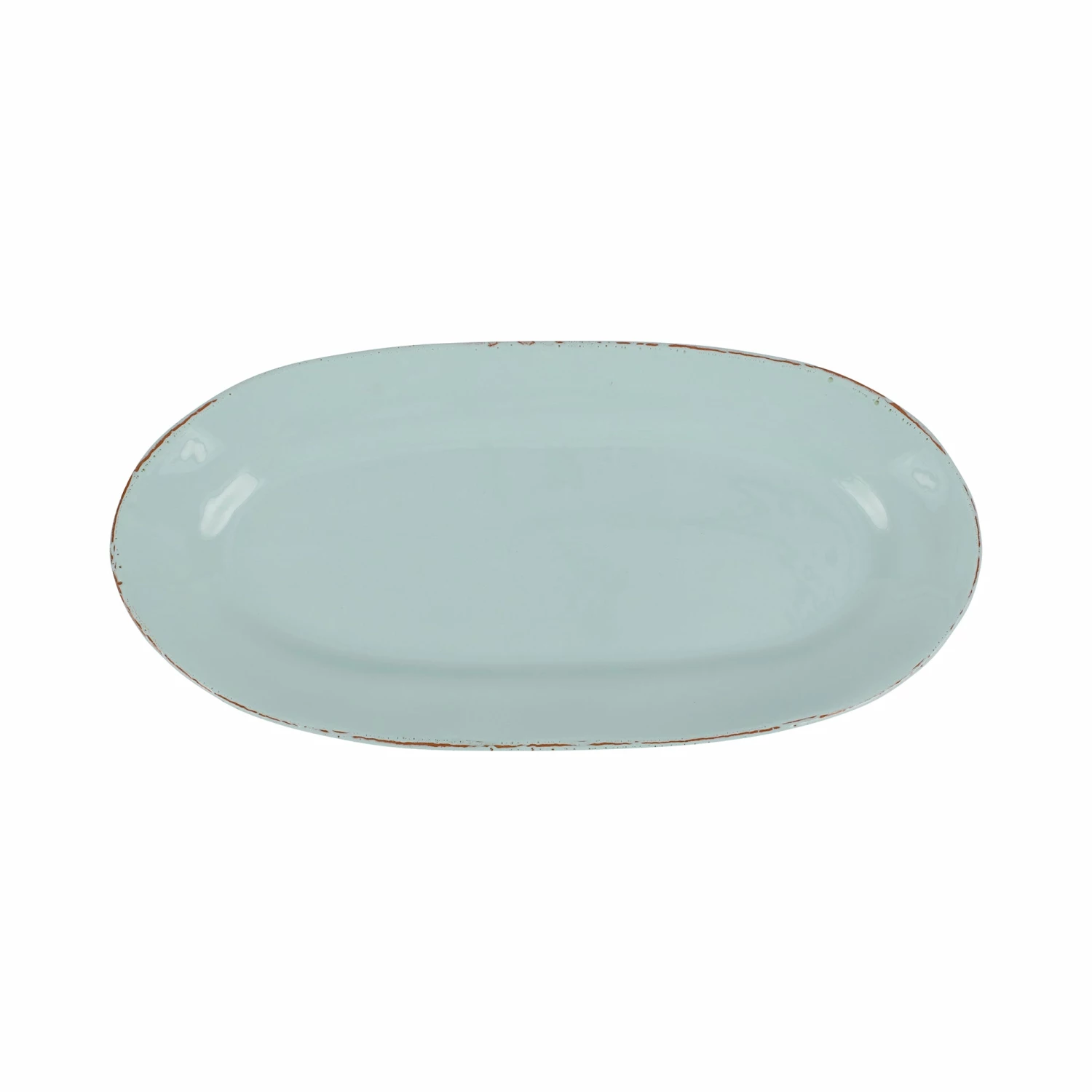 The Cucina Fresca Aqua Narrow Oval Platter features raw terra cotta edges and a cool blue glaze reminiscent of the expansive Tuscan sky. The collection was inspired by the rustic, simple pottery of 14th-century Italy.