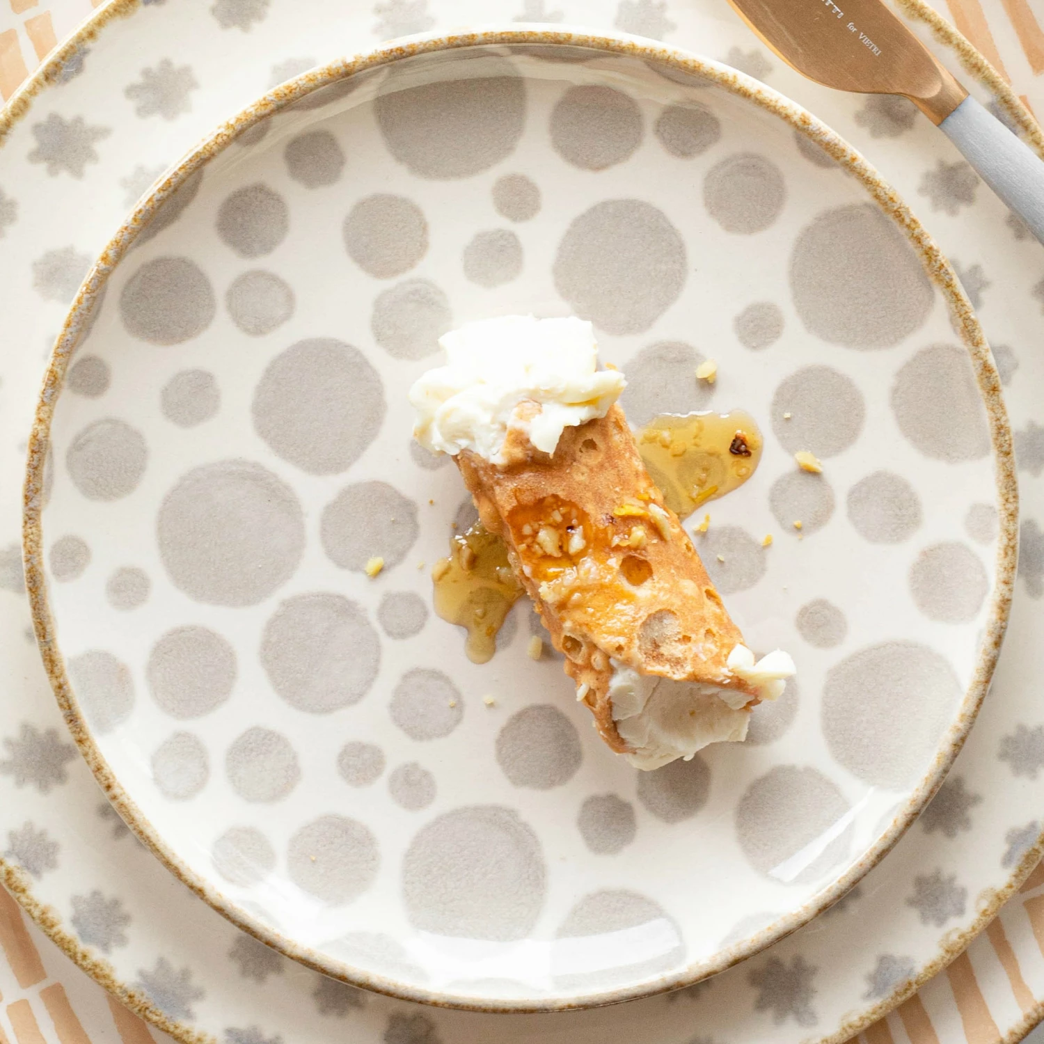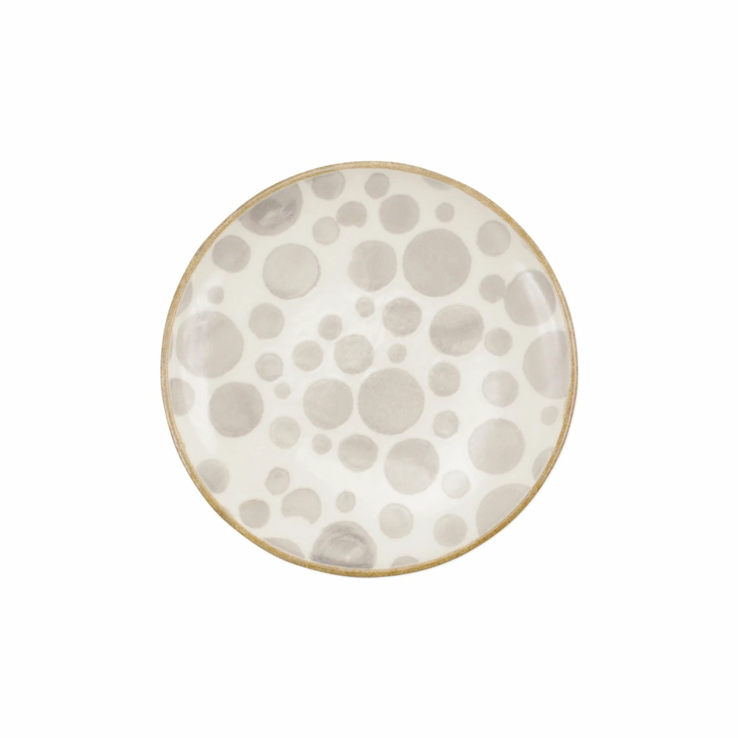 The Earth Bubble Cocktail Plate combines mid-century neutral tones with an angled silhouette in a playful handpainted pattern.