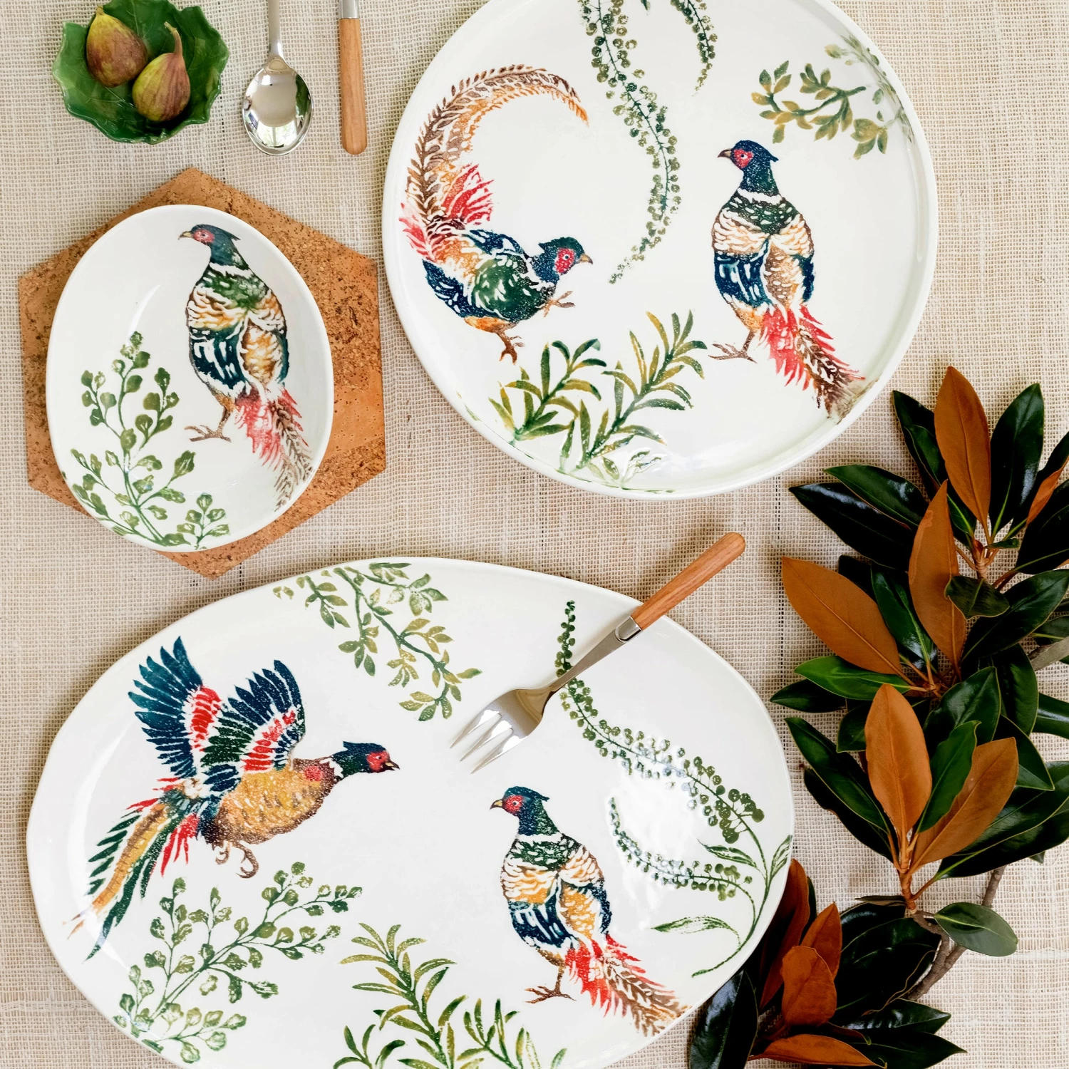 The Fauna Pheasants Large Oval Platter combines the outline of the classic hunting bird paired with nature’s greenery to depict what is commonly found during the hunt (la caccia) in Umbria, the Italian land known for capturing wild pheasants.
