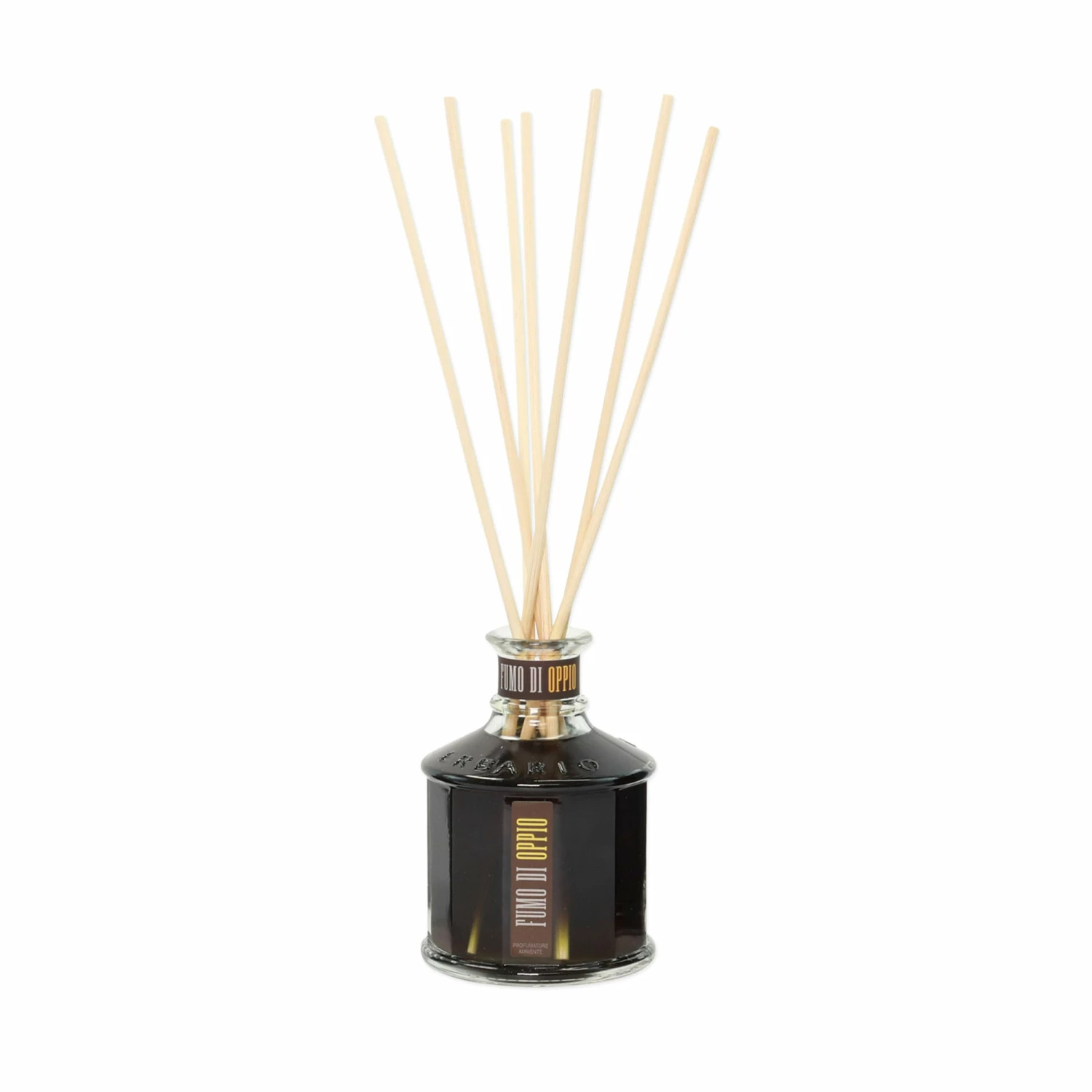 The warming spices of cumin, cinnamon, and cardamom combine with the woody earthiness of cedarwood and sandalwood to create a masculine, rich, and grounding fragrance. Balanced and smooth with a hint of mystery, the Fumo di Oppio Luxury Home Fragrance Diffuser comes in a beautiful mouthblown vessel that doubles as artwork in your home. To use, remove the stopper and dip the sticks into the fragrance. Flip the sticks upside down in order to renew the fragrance.