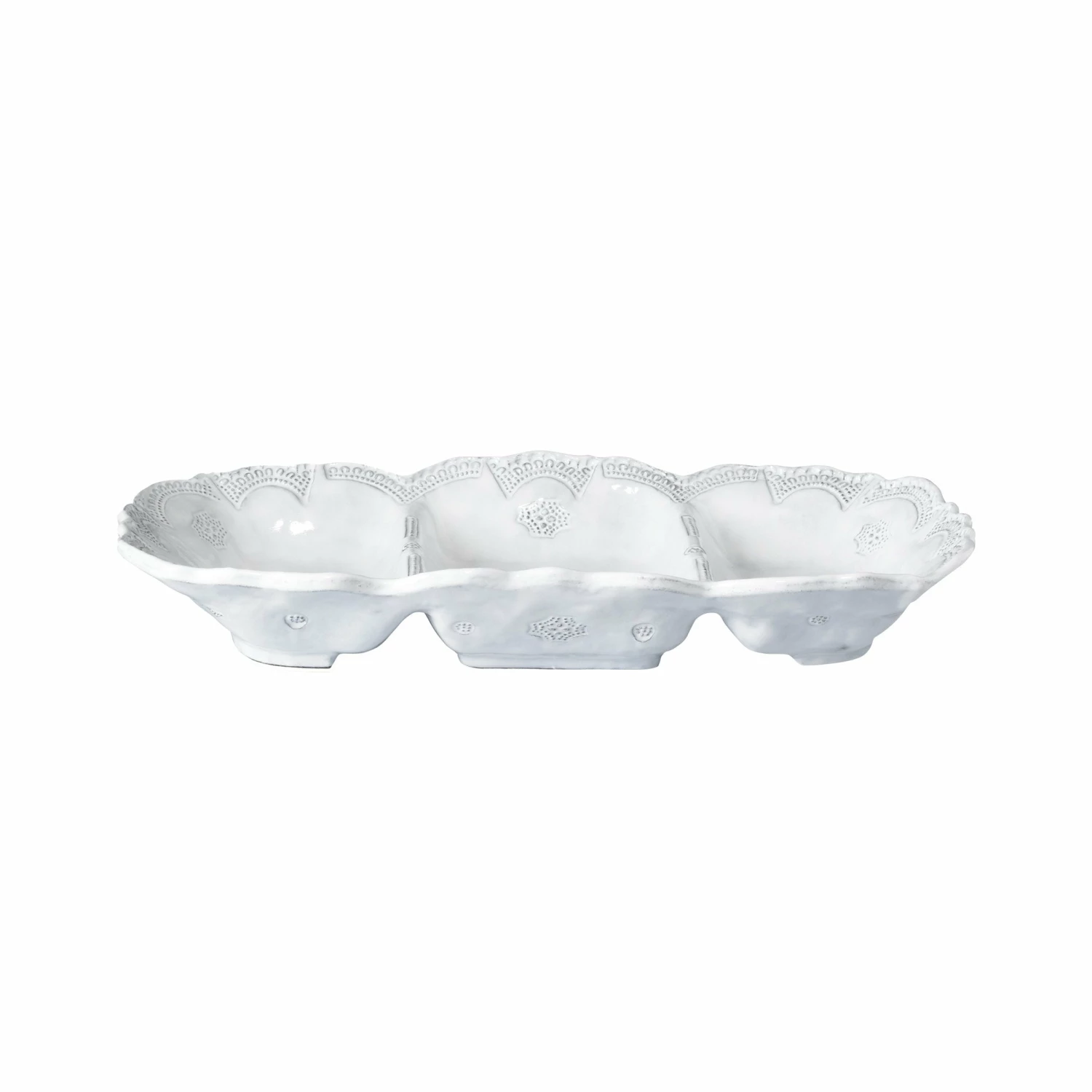 Italian for enchantment, Incanto is inspired by Italian art, the landscape, and Venetian history. The intricate designs on the Incanto Lace Medium Three-Part Server pay homage to the famed lace of Veniceβs Burano Island. This piece is a delightful way to serve a trio of nuts, a selection of berries, or an assortment of candies.