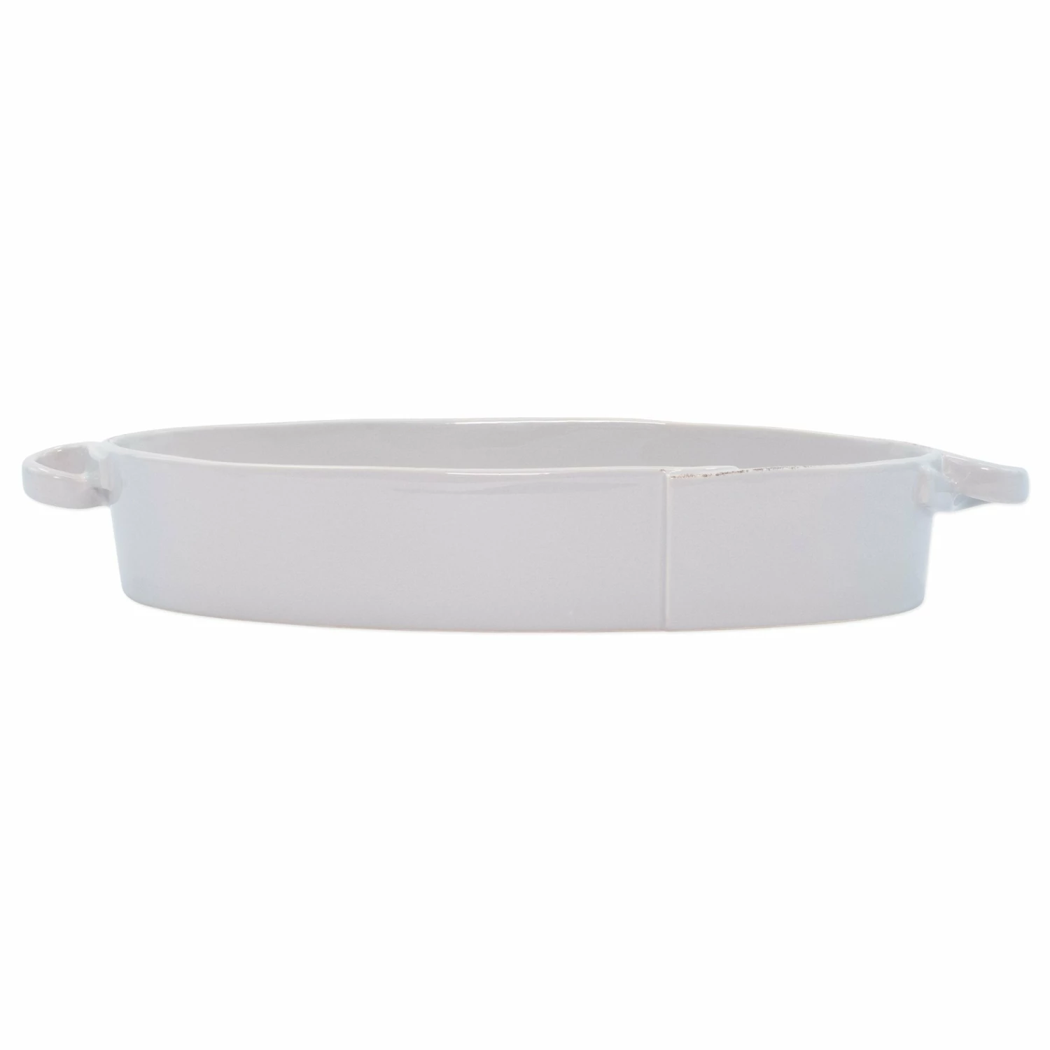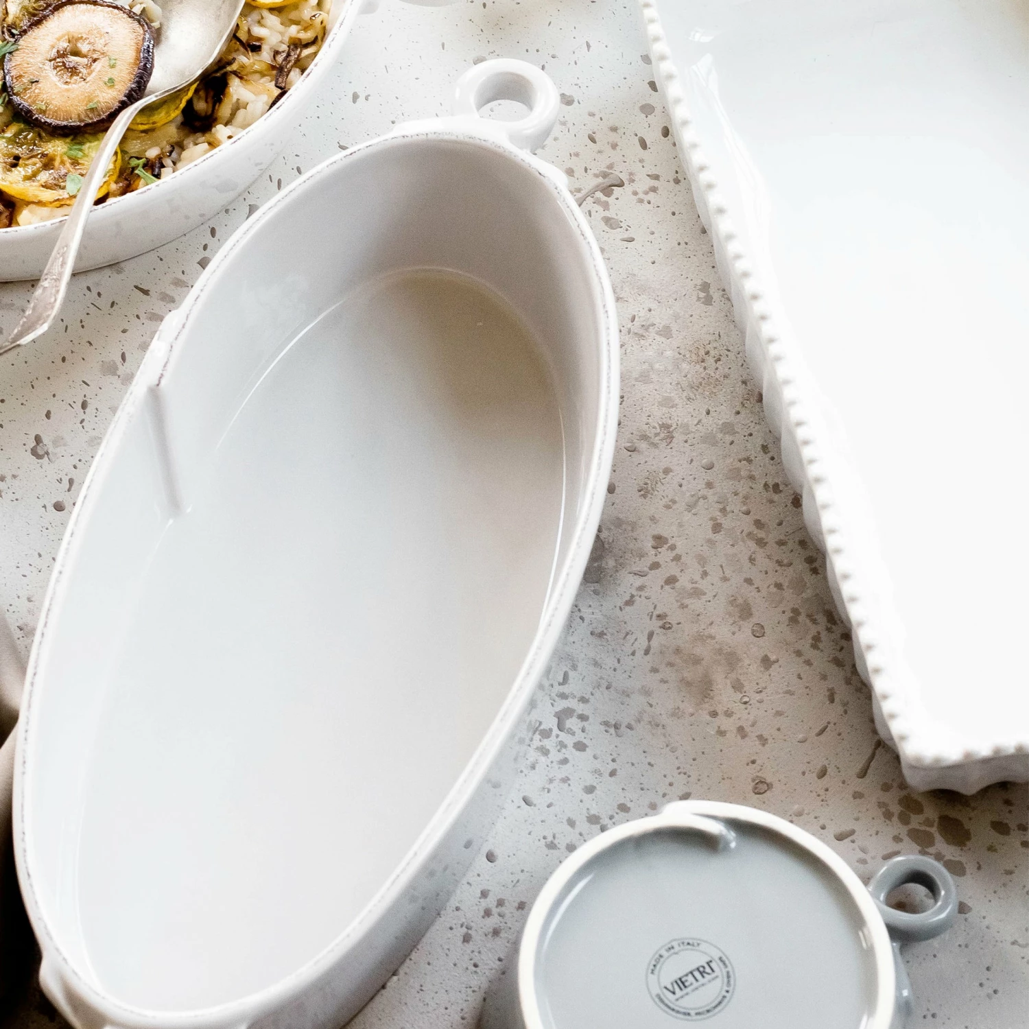 | Beloved for its sophisticated simplicity, versatility, and durability, Lastra is our bestselling collection. The understated elegance, clean lines, and unique shape of the Lastra Handled Oval Baker make it a timeless baking and serving piece. Lastraโs design was inspired by the circular wooden slabs used for centuries to create the outer mold in cheesemaking throughout Italy. When fashioned together with twine, the hoop was left with a slight overlap to help maintain the shape of the cheese mold. Maestro molder Stefano Roselli incorporates the overlapping detail into the entire design, from its foot to its rim. A dark dusting on the edges of each piece suggests the ash that was used to preserve these cheeses and highlights each unique silhouette. |