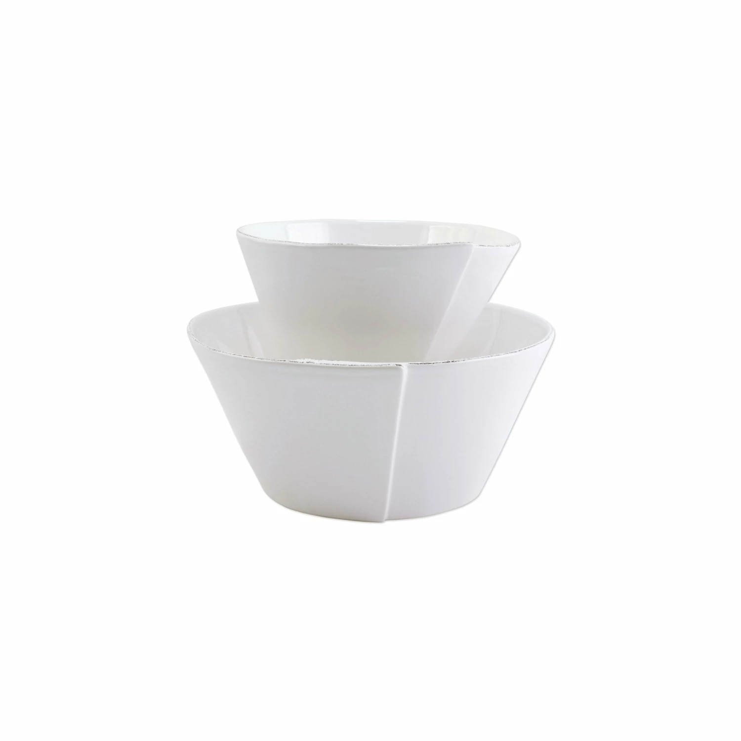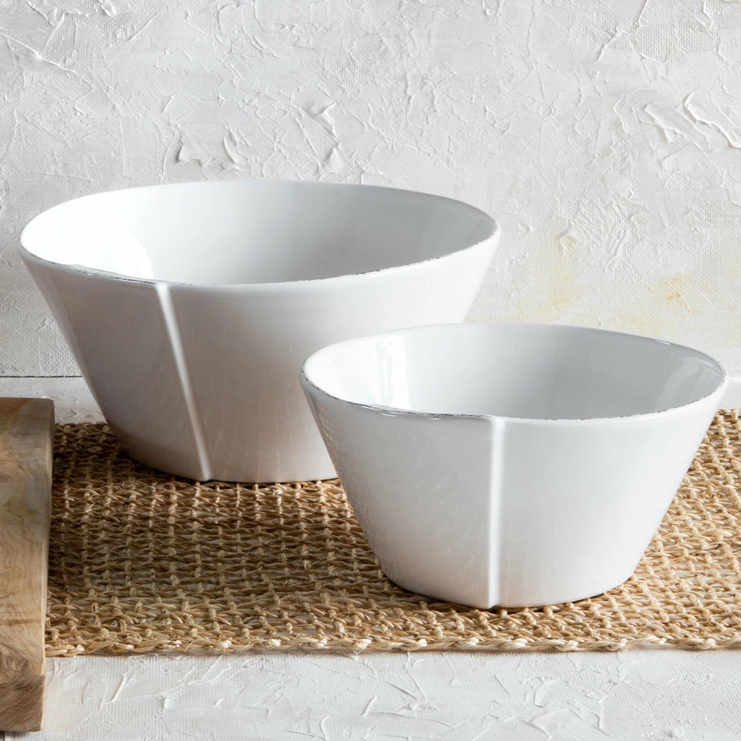 Beloved for its sophisticated simplicity, versatility, and durability, Lastra is our bestselling collection. The Lastra White Two-Piece Serving Bowl Set includes the Lastra White Medium Stacking Serving Bowl and the Lastra White Large Stacking Serving Bowl. It is a beautiful set for anyone who likes to cook or entertain. Lastraβs design was inspired by the circular wooden slabs used for centuries to create the outer mold in cheesemaking throughout Italy. When fashioned together with twine, the hoop was left with a slight overlap to help maintain the shape of the cheese mold. Maestro molder Stefano Roselli incorporates the overlapping detail into the entire design, from its foot to its rim. A dark dusting on the edges of each piece suggests the ash that was used to preserve these cheeses and highlights each unique silhouette.