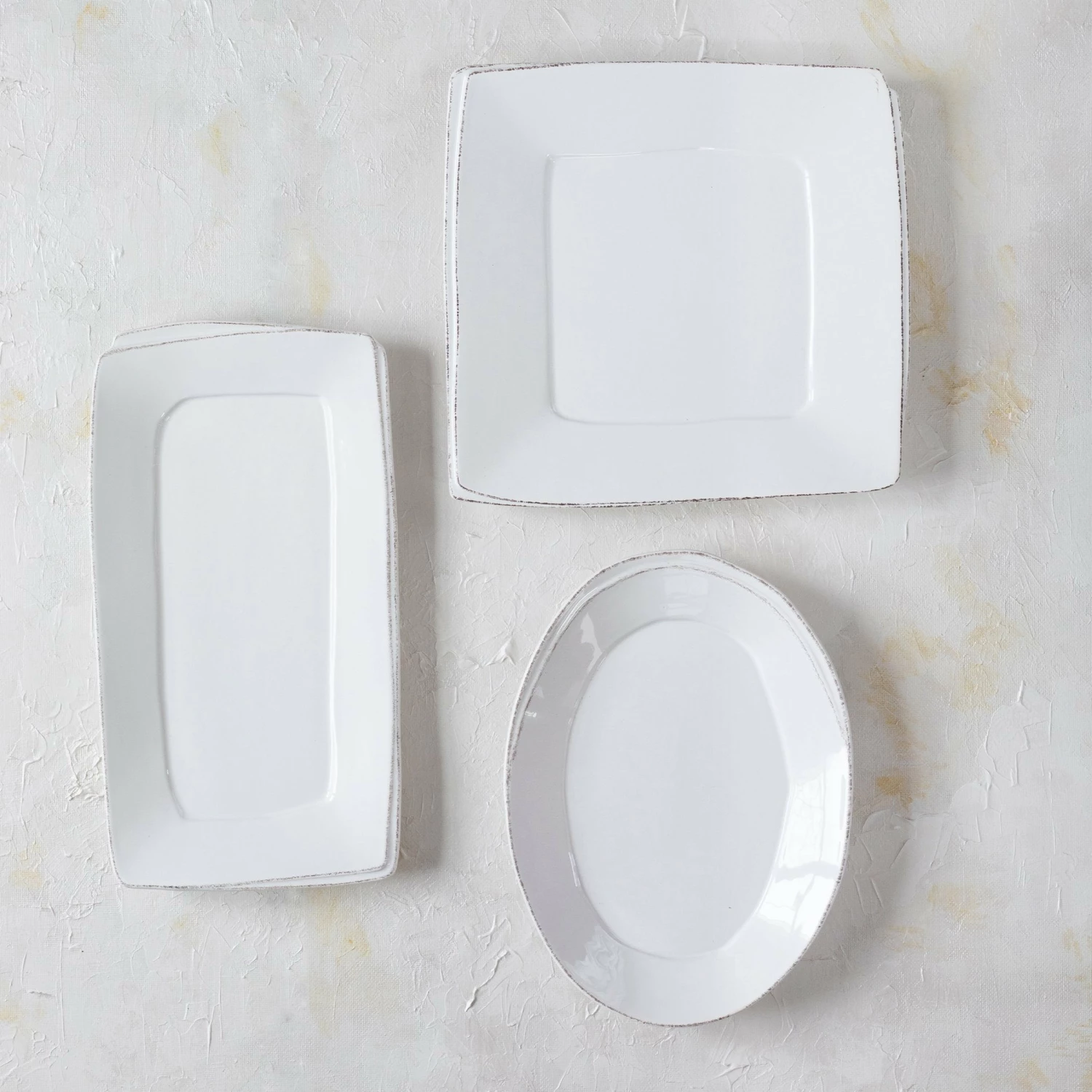 Beloved for its sophisticated simplicity, versatility, and durability, Lastra is our bestselling collection. The Lastra White Three-Piece Serveware Set includes the Lastra White Small Oval Platter, the Lastra White Square Platter, and the Lastra White Rectangular Platter. It is a beautiful set for anyone who likes to cook or entertain. Lastraβs design was inspired by the circular wooden slabs used for centuries to create the outer mold in cheesemaking throughout Italy. When fashioned together with twine, the hoop was left with a slight overlap to help maintain the shape of the cheese mold. Maestro molder Stefano Roselli incorporates the overlapping detail into the entire design, from its foot to its rim. A dark dusting on the edges of each piece suggests the ash that was used to preserve these cheeses and highlights each unique silhouette.