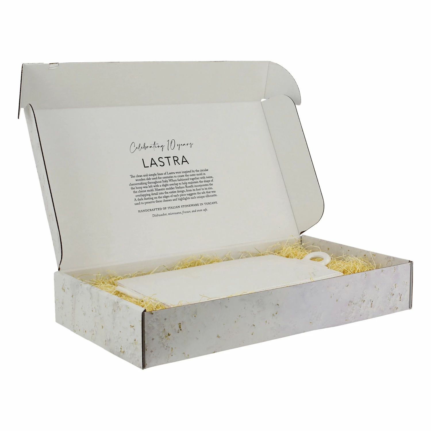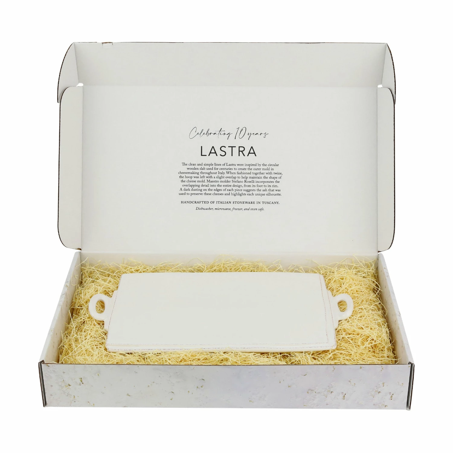 Beloved for its sophisticated simplicity, versatility, and durability, Lastra is our bestselling collection. The understated elegance, clean lines, and unique shape of the Lastra White Cheese Board make it a timeless choice for your home. Lastraβs design was inspired by the circular wooden slabs used for centuries to create the outer mold in cheesemaking throughout Italy. When fashioned together with twine, the hoop was left with a slight overlap to help maintain the shape of the cheese mold. Maestro molder Stefano Roselli incorporates the overlapping detail into the entire design, from its foot to its rim. A dark dusting on the edges of each piece suggests the ash that was used to preserve these cheeses and highlights each unique silhouette. This timeless piece comes packaged in a limited edition celebration box in honor of Lastra’s 10th Anniversary.