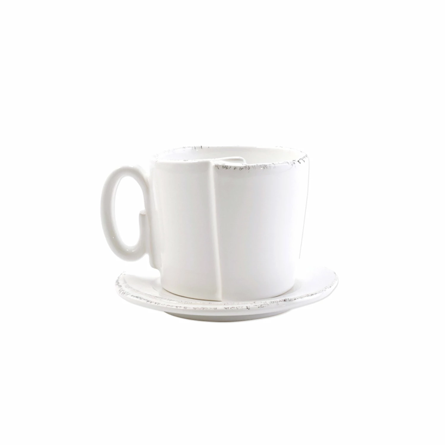 Beloved for its sophisticated simplicity, versatility, and durability, Lastra is our bestselling collection. The understated elegance, clean lines, and unique shape of the Lastra White Cup and Saucer make it a timeless choice for any table and a charming tea or coffee companion. Lastraβs design was inspired by the circular wooden slabs used for centuries to create the outer mold in cheesemaking throughout Italy. When fashioned together with twine, the hoop was left with a slight overlap to help maintain the shape of the cheese mold. Maestro molder Stefano Roselli incorporates the overlapping detail into the entire design, from its foot to its rim. A dark dusting on the edges of each piece suggests the ash that was used to preserve these cheeses and highlights each unique silhouette.