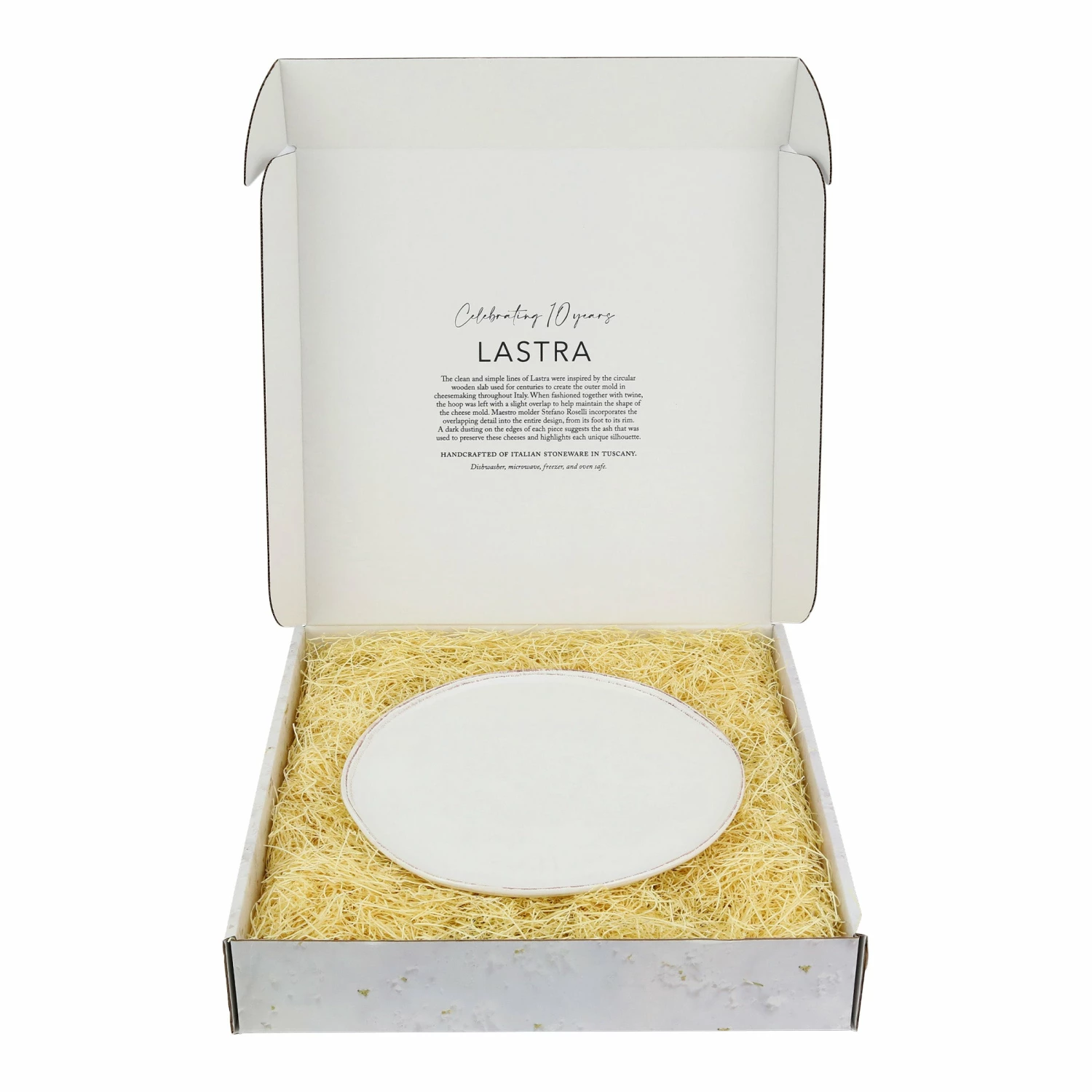 Beloved for its sophisticated simplicity, versatility, and durability, Lastra is our bestselling collection. The understated elegance, clean lines, and unique shape of the Lastra White Pizza Platter make it a timeless choice for your home. Lastraβs design was inspired by the circular wooden slabs used for centuries to create the outer mold in cheesemaking throughout Italy. When fashioned together with twine, the hoop was left with a slight overlap to help maintain the shape of the cheese mold. Maestro molder Stefano Roselli incorporates the overlapping detail into the entire design, from its foot to its rim. A dark dusting on the edges of each piece suggests the ash that was used to preserve these cheeses and highlights each unique silhouette. This timeless piece comes packaged in a limited edition celebration box in honor of Lastra’s 10th Anniversary.
