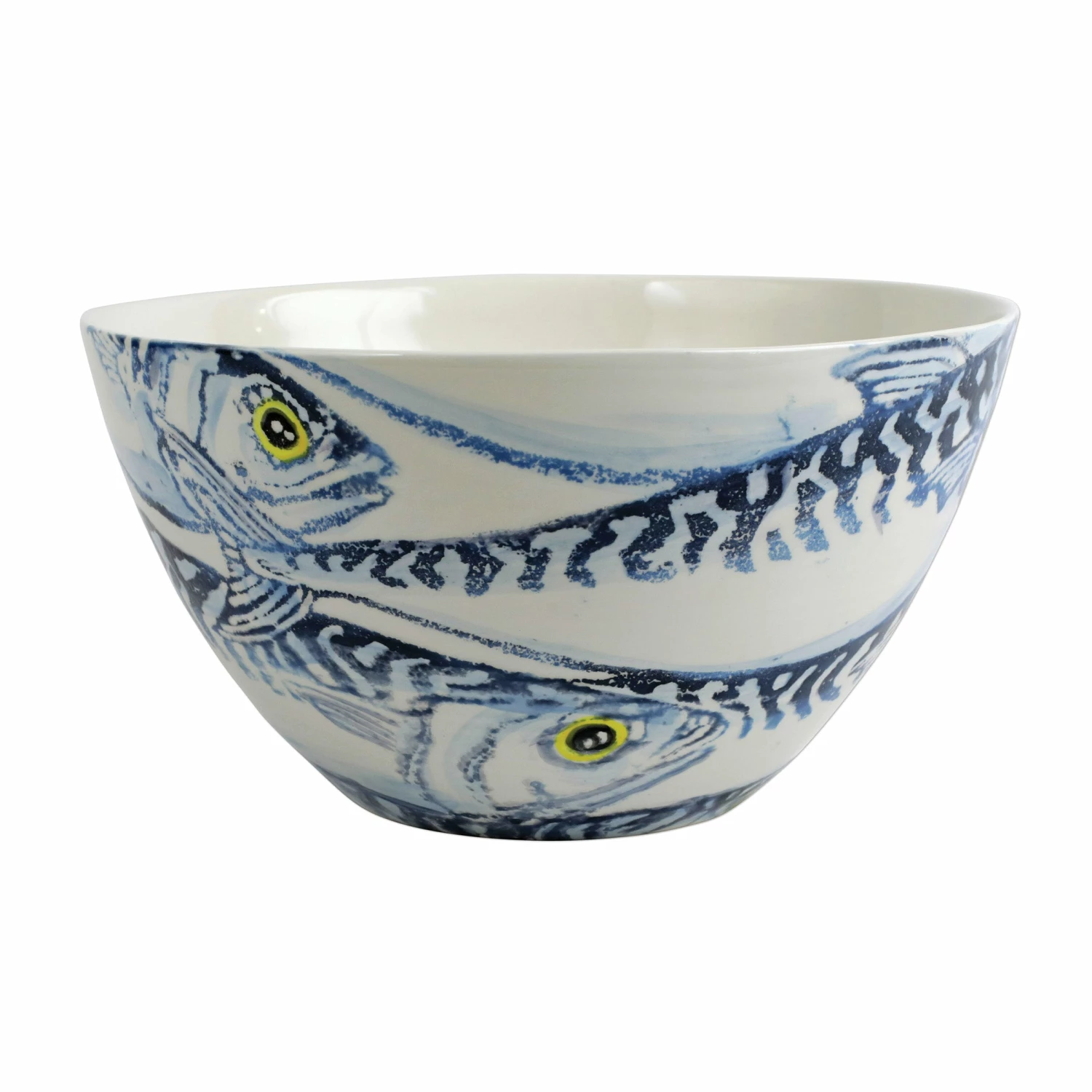 The Maccarello Deep Serving Bowl illustrates a school of blue mackerel, commonly found along the Mediterranean and Adriatic Sea, handpainted by maestro artisan, Gianluca Fabbro, using his unique sponging technique.