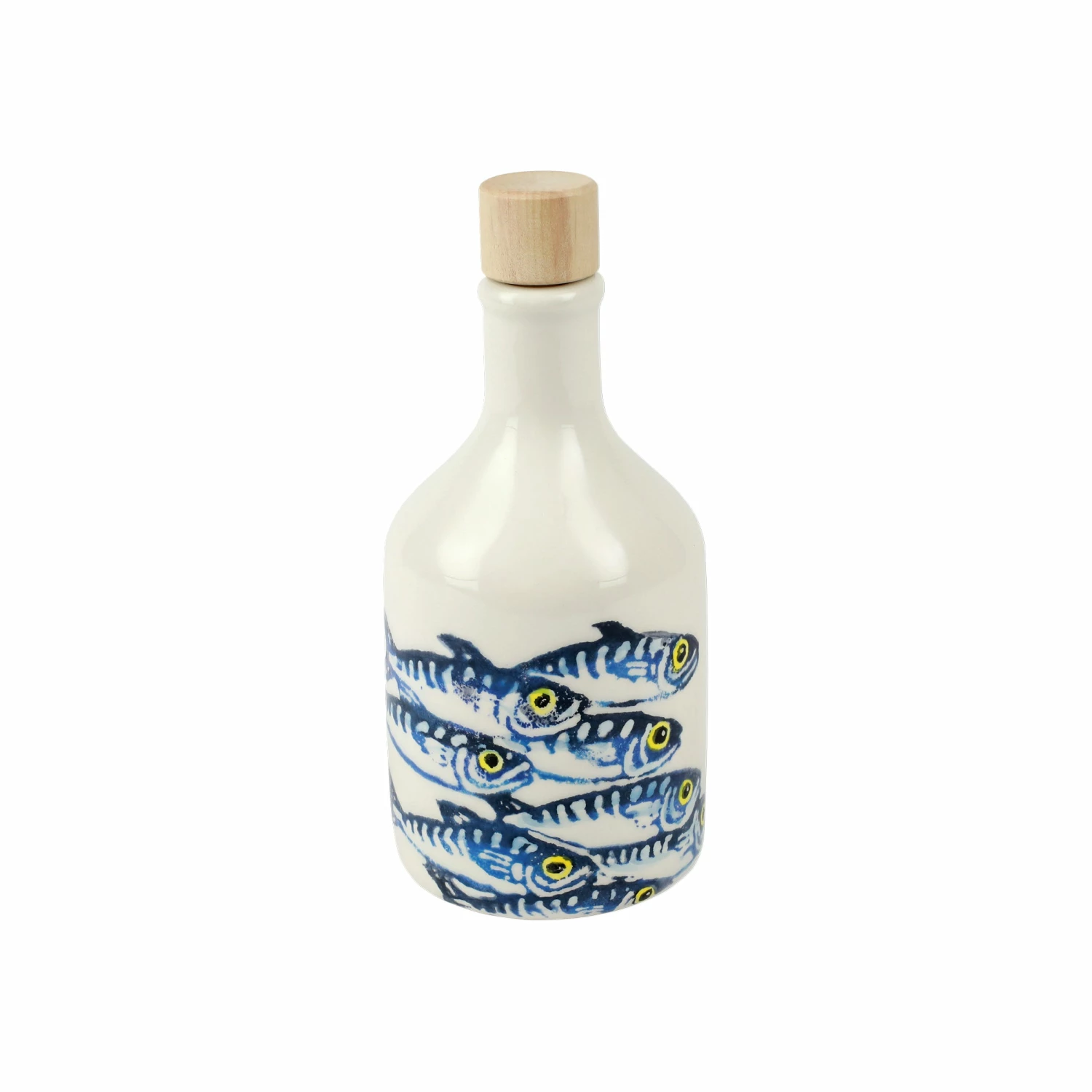 The Maccarello Olive Oil Bottle illustrates a school of blue mackerel, commonly found along the Mediterranean and Adriatic Sea, handpainted by maestro artisan Gianluca Fabbro. Gianluca uses a unique sponging technique to create intricate, lifelike detail.