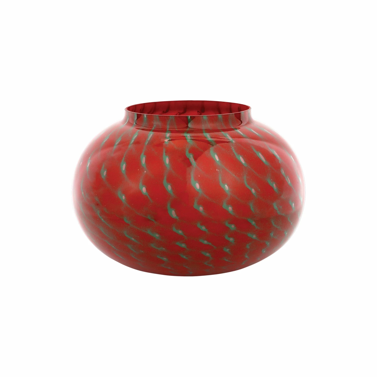 The Marcato Glass Small Round Vase is a beautiful and one-of-a-kind statement piece perfect for holiday decor. Each mouthbown vase is unique and features a sophisticated pattern of red and green.