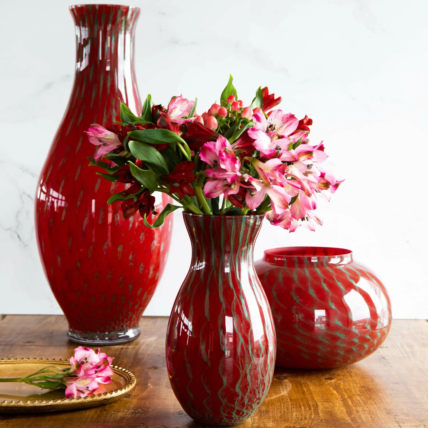 The Marcato Glass Small Vase is a beautiful and one-of-a-kind statement piece perfect for holiday decor. Each mouthbown vase is unique and features a sophisticated pattern of red and green.