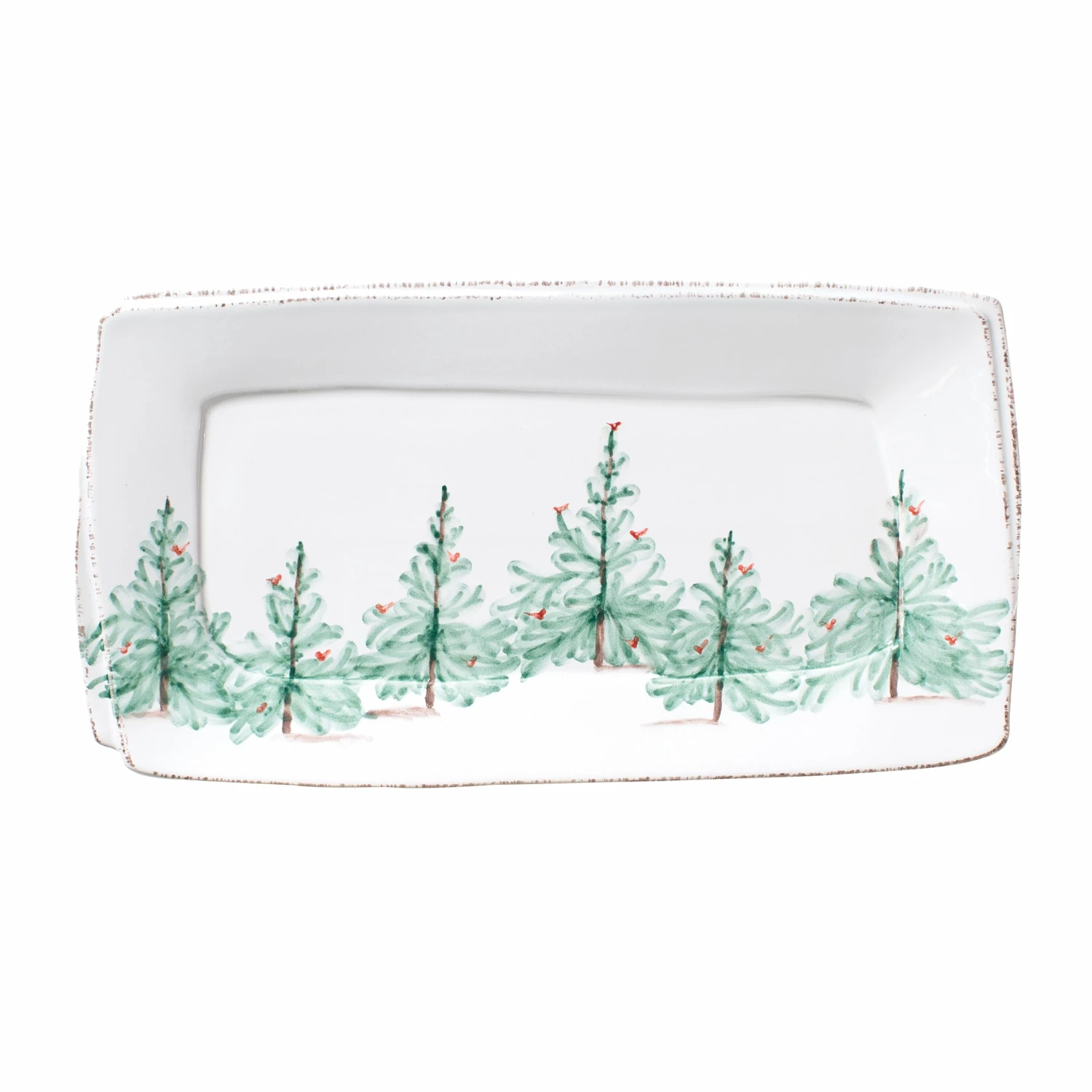 Lastra Holidayβs unique silhouettes and cheerful design take a new form on the Melamine Lastra Holiday Rectangular Platter. Delight in the magic of the holiday season as handpainted fir trees and red birds drift across the fresh white canvas of this beautiful serving piece. Lightweight yet sturdy with a glossy finish, this collection is ideal for outdoor use or meals with children.