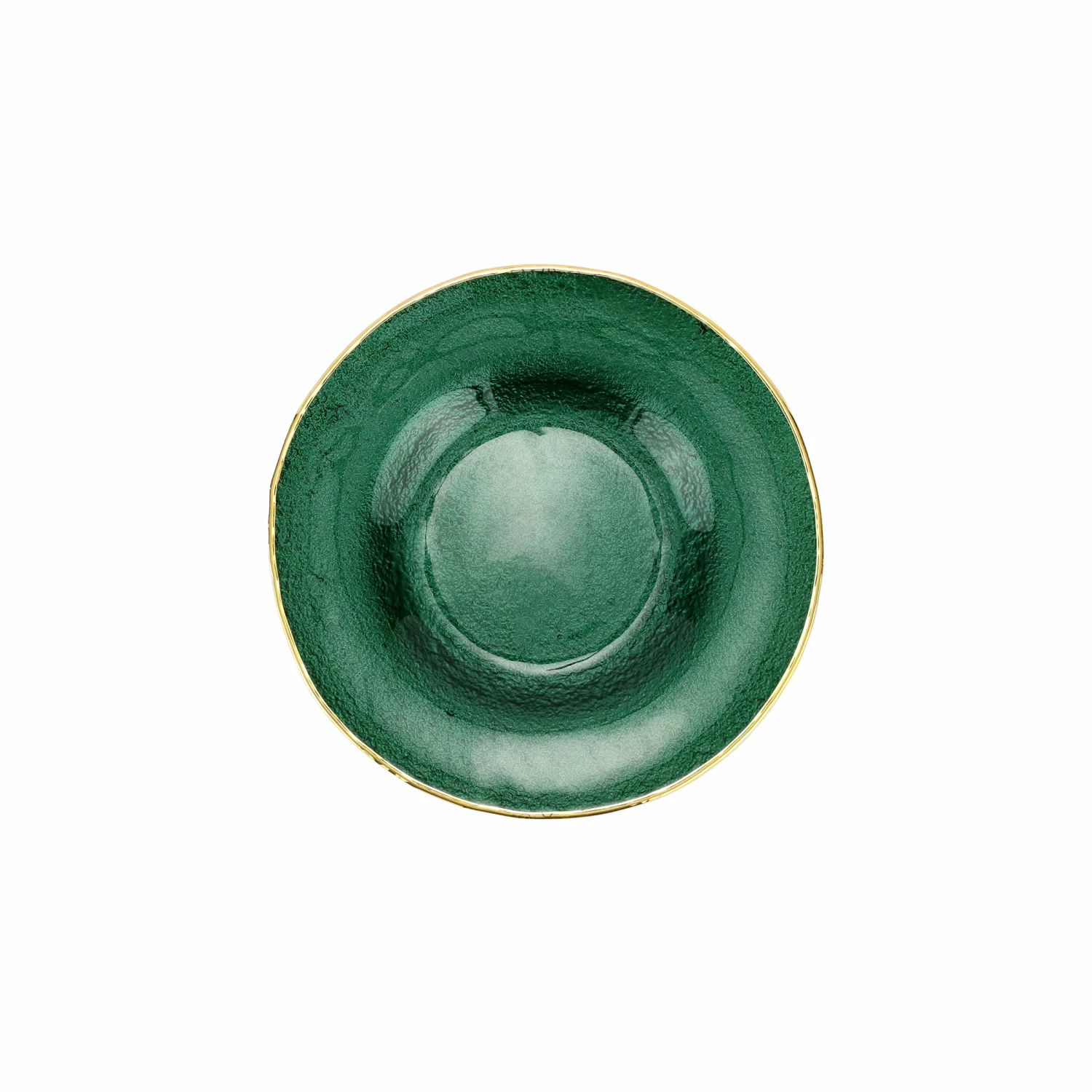Metallic Glass is a dynamic collection that is at once timeless and modern. With a beautiful, molten effect, each piece is rimmed in gold and instantly elevates any table setting. The Metallic Glass Emerald Salad Plate exudes timeless glamour and is made to be mixed and matched with other Metallic Glass pieces.