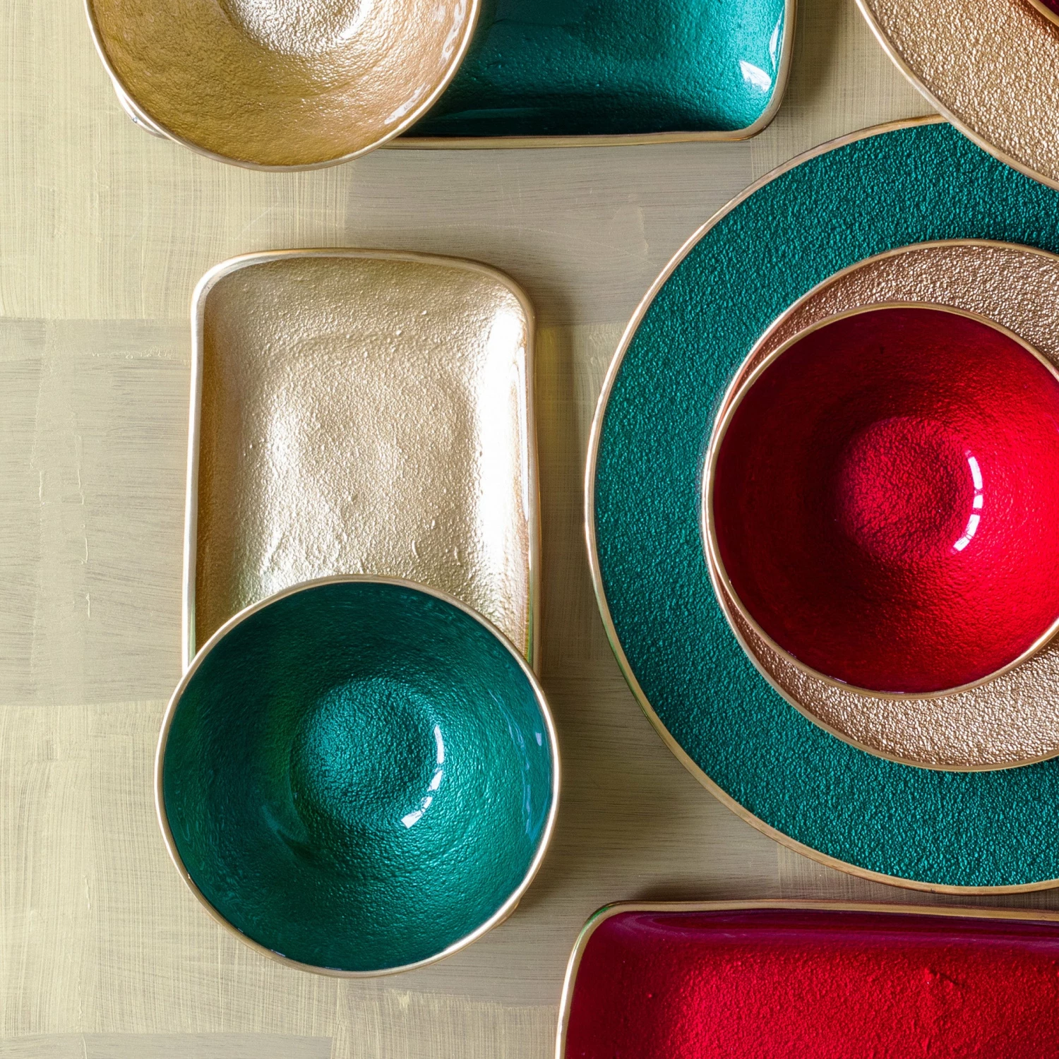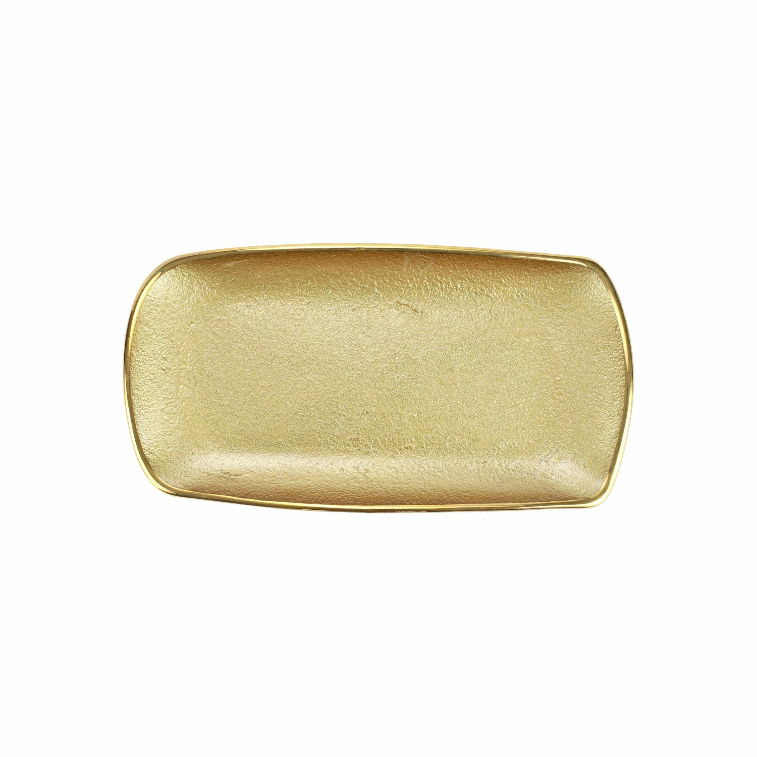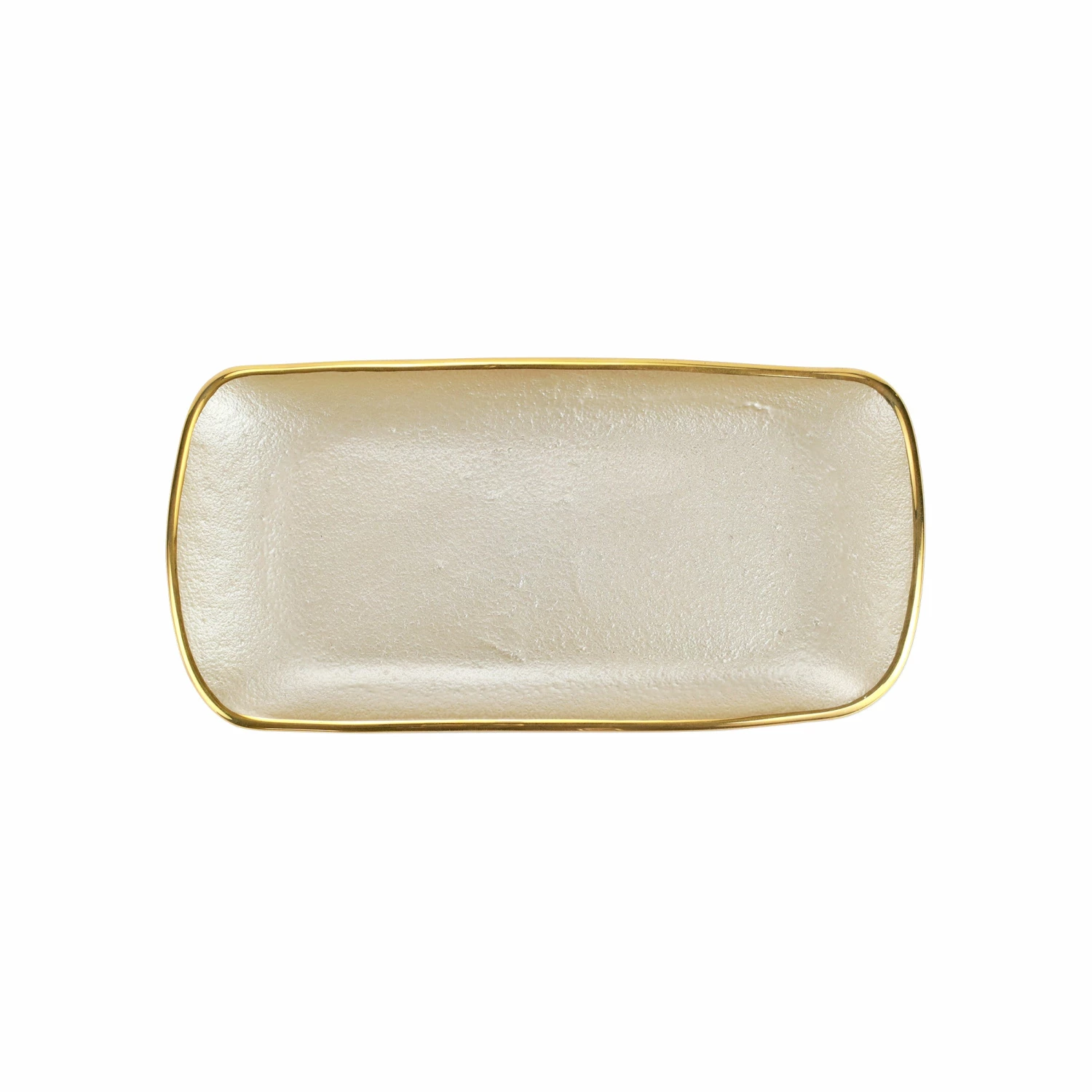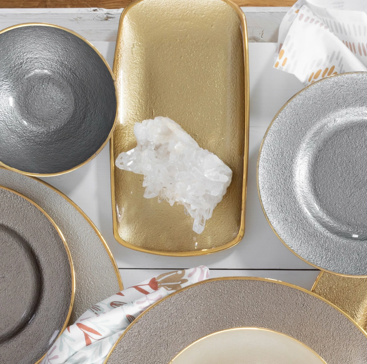 Metallic Glass is a dynamic collection that is at once timeless and modern. With a beautiful, molten effect, each piece is rimmed in gold and instantly elevates any table setting. The Metallic Glass Fawn Rectangular Tray exudes timeless glamour and is a statement piece on its own or mixed with other Metallic Glass pieces.