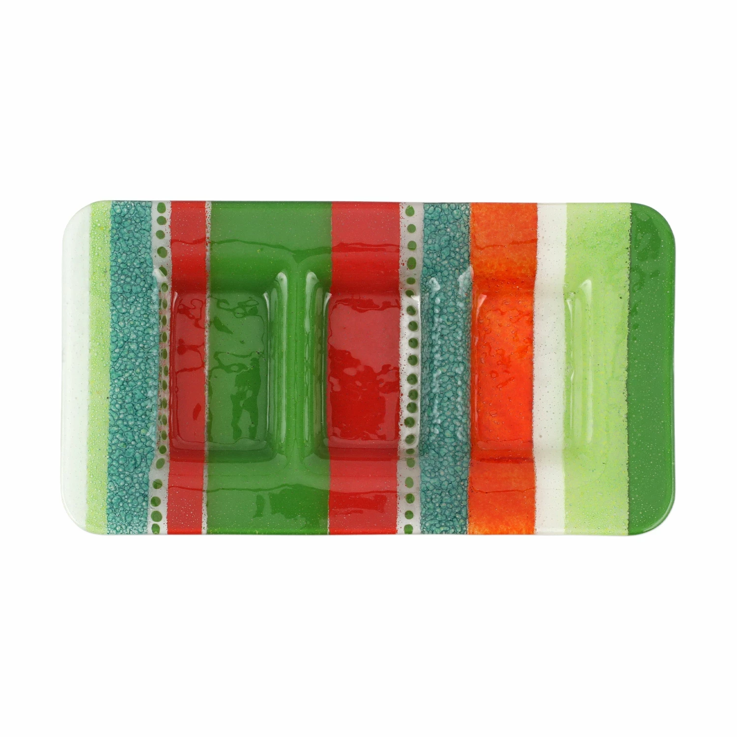 Bring the spirit of the holidays alive with bright colors and festive shapes. Each festive Natale Glass Three-Part Server is carefully decorated by hand before undergoing a 12-hour fusion process where the colors and the glass fuse together to create a beautiful piece of art.