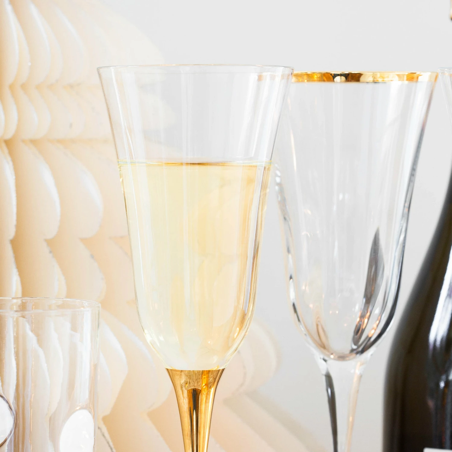 The Optical Gold Champagne Glass is trimmed in a delicate gilded rim, and its elegant lines bring sophistication and glamour to every table. The golden embellishment of this Italian champagne glass is effortlessly beautiful.