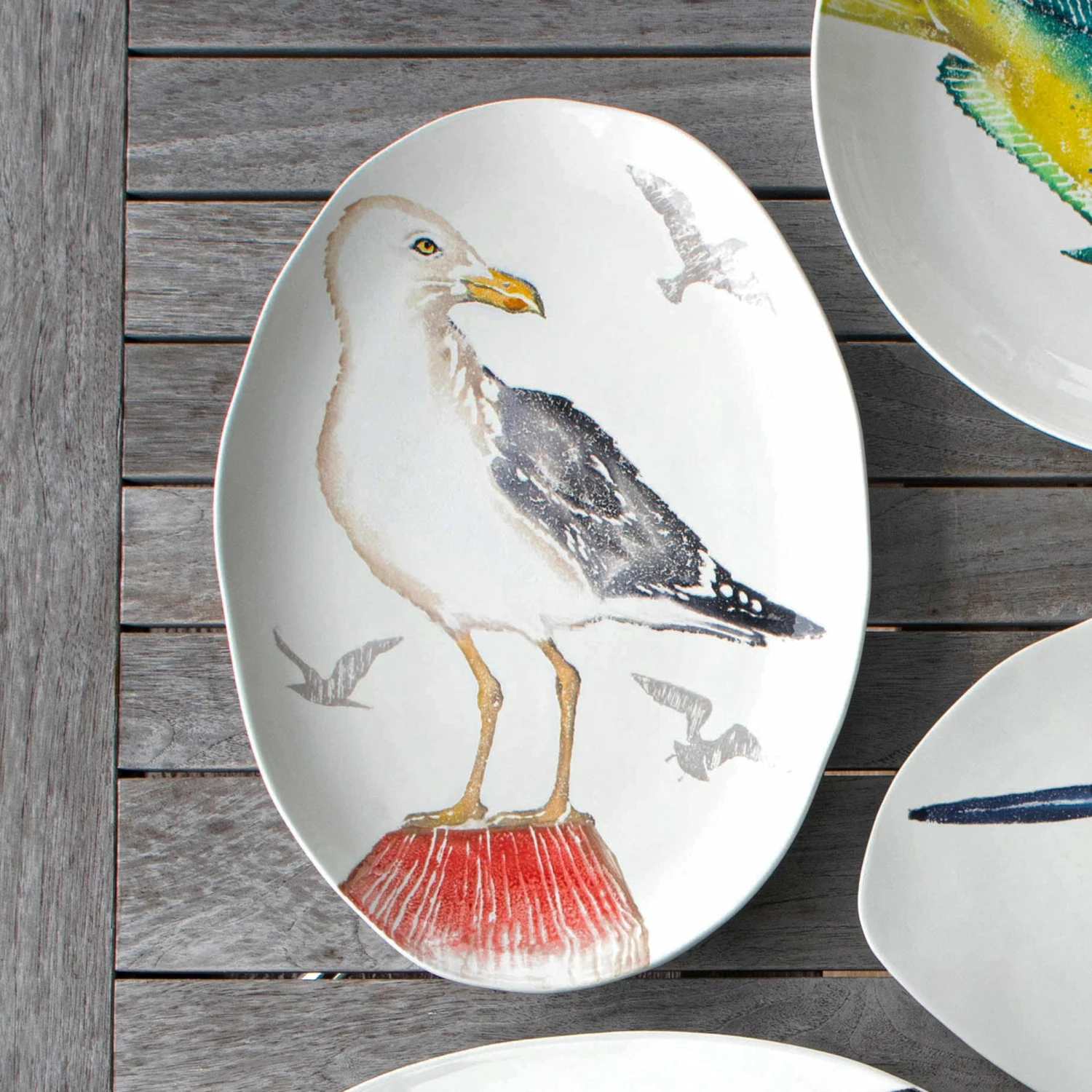 Interpreted from a walk on a Santa Barbara pier, the Pesca Seagull Medium Oval Platter features a classic fishing subject the Italian way.