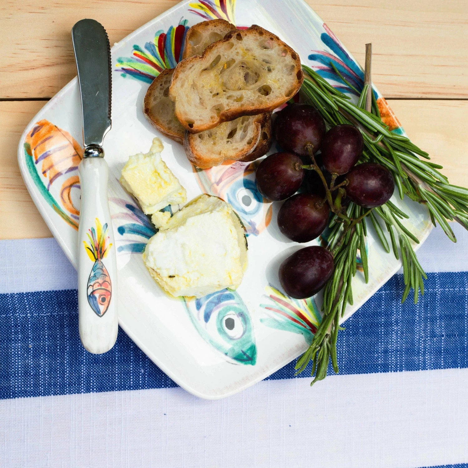 A traditional school of fish was the original inspiration for the Pesci Colorati Ceramic Square Plate w/ Spreader. Our maestro artisans put their signature spin on the design with layers of color in handpainted detail to add variety and texture.