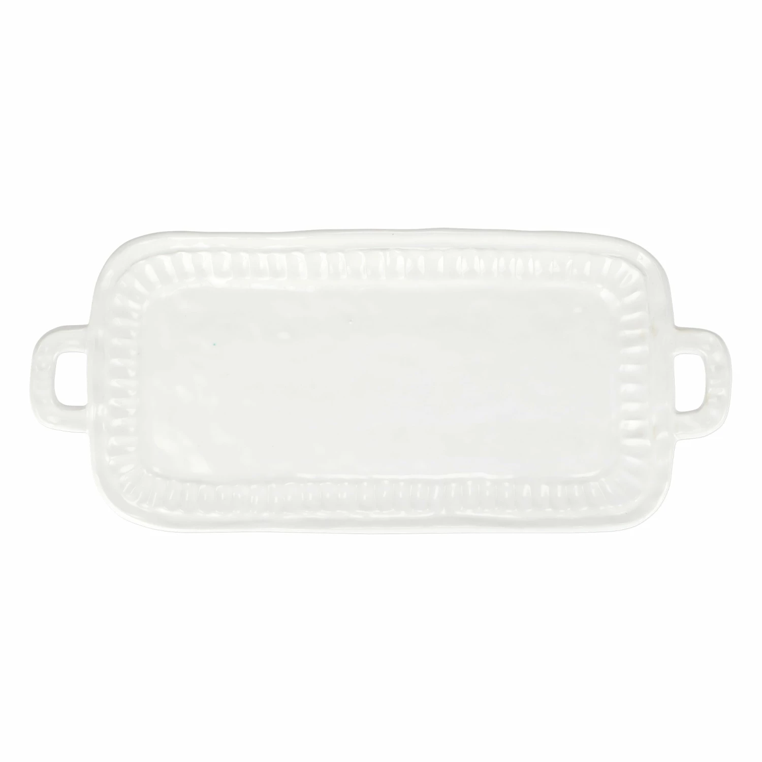 Pietra Serena, meaning serene stone, represents the simplistic beauty of the handpressed design found on the Pietra Serena Handled Rectangular Platter.