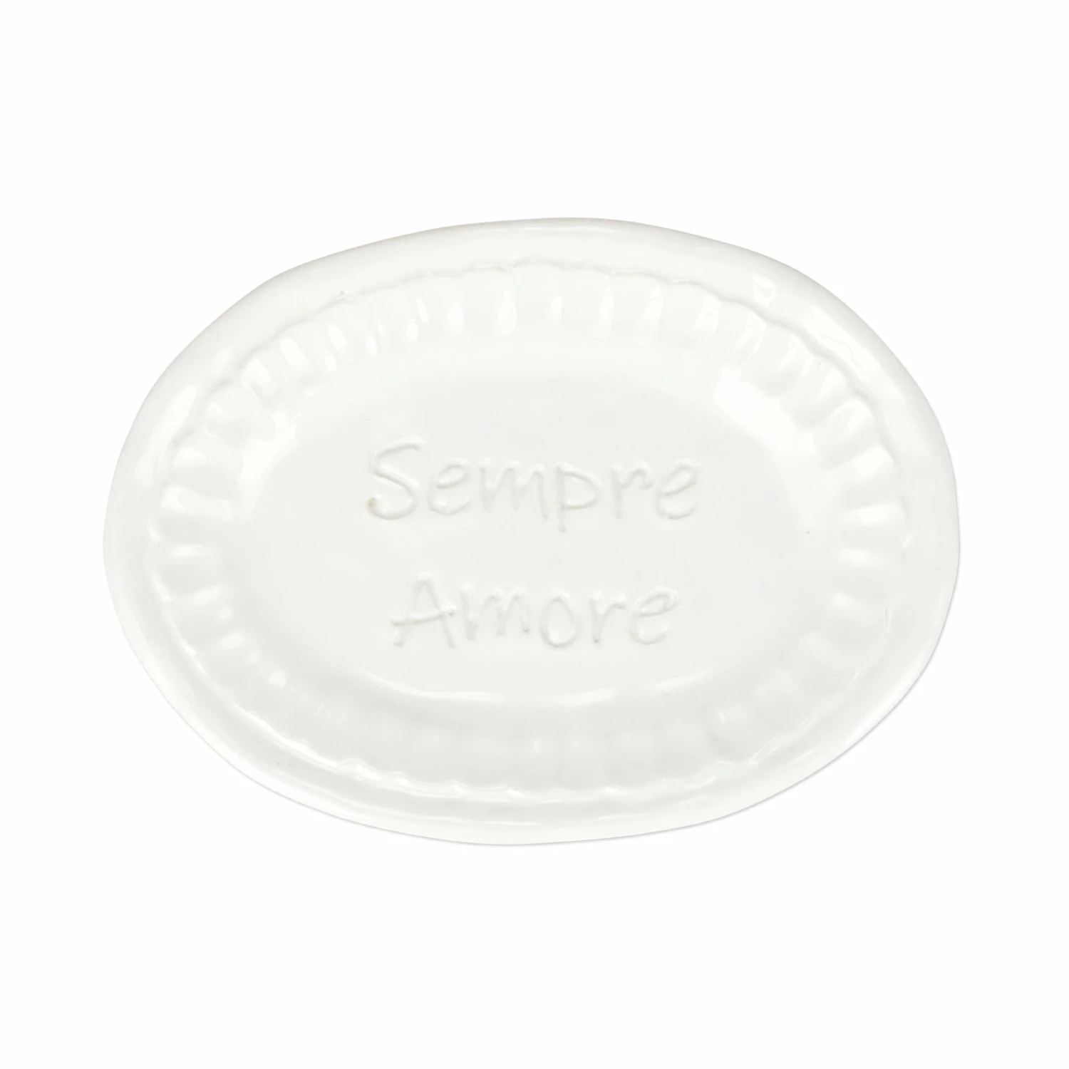 Pietra Serena, meaning serene stone, represents the simplistic beauty of the handpressed design found on the Pietra Serena Sempre Amore Small Oval Plate.