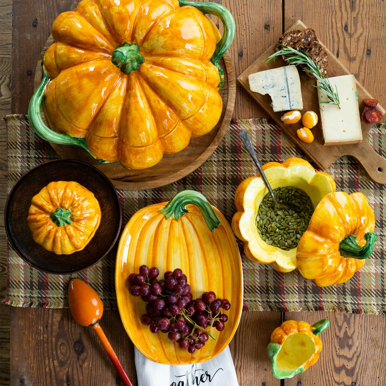 Inspired by a walk through the lively street markets in Florence, the Pumpkins Figural Pumpkin Small Oval Platter is a playful yet sophisticated take on the fall harvest.