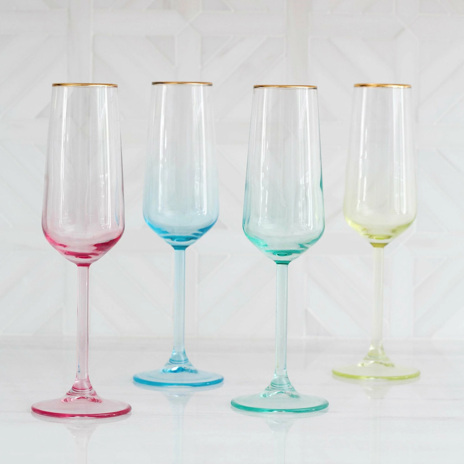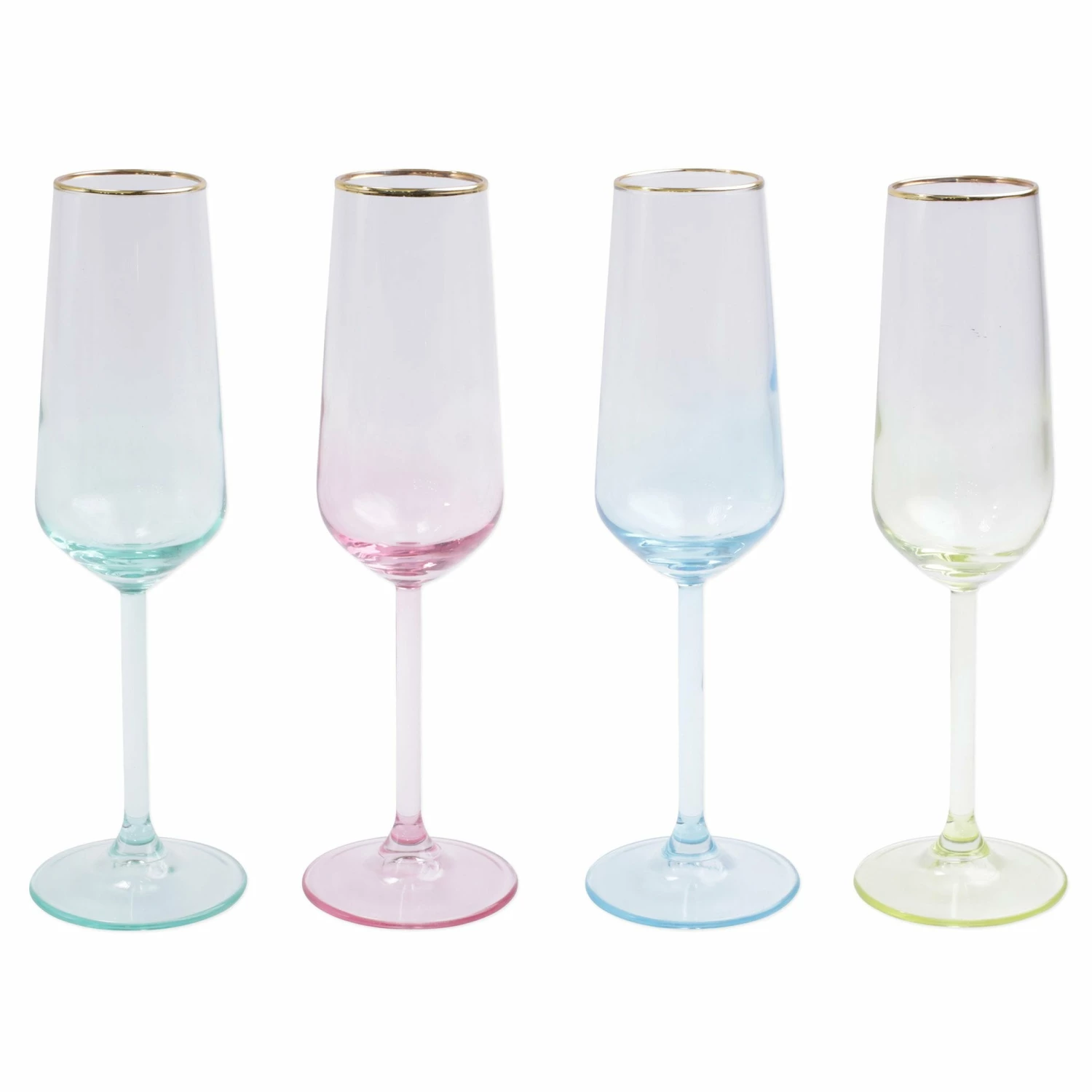 Add sparkle to any setting with a gilded gold rim and varied colored glass that refracts light on the Rainbow Assorted Champagne Flutes – Set of 4.