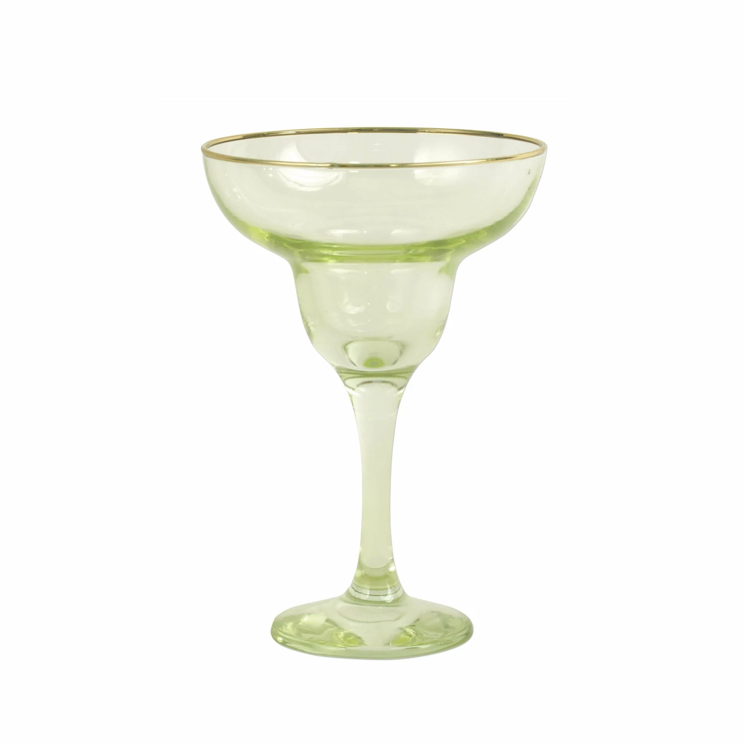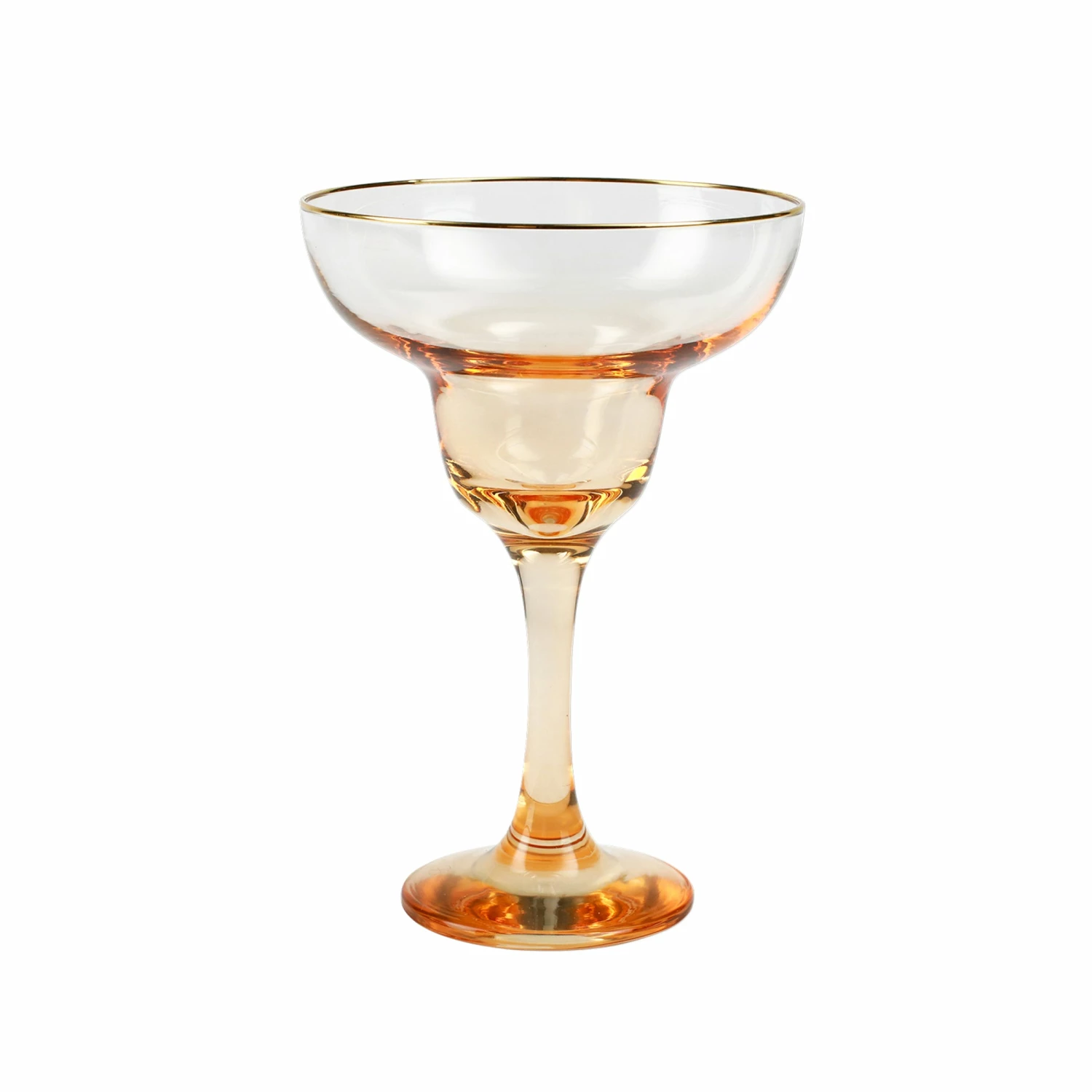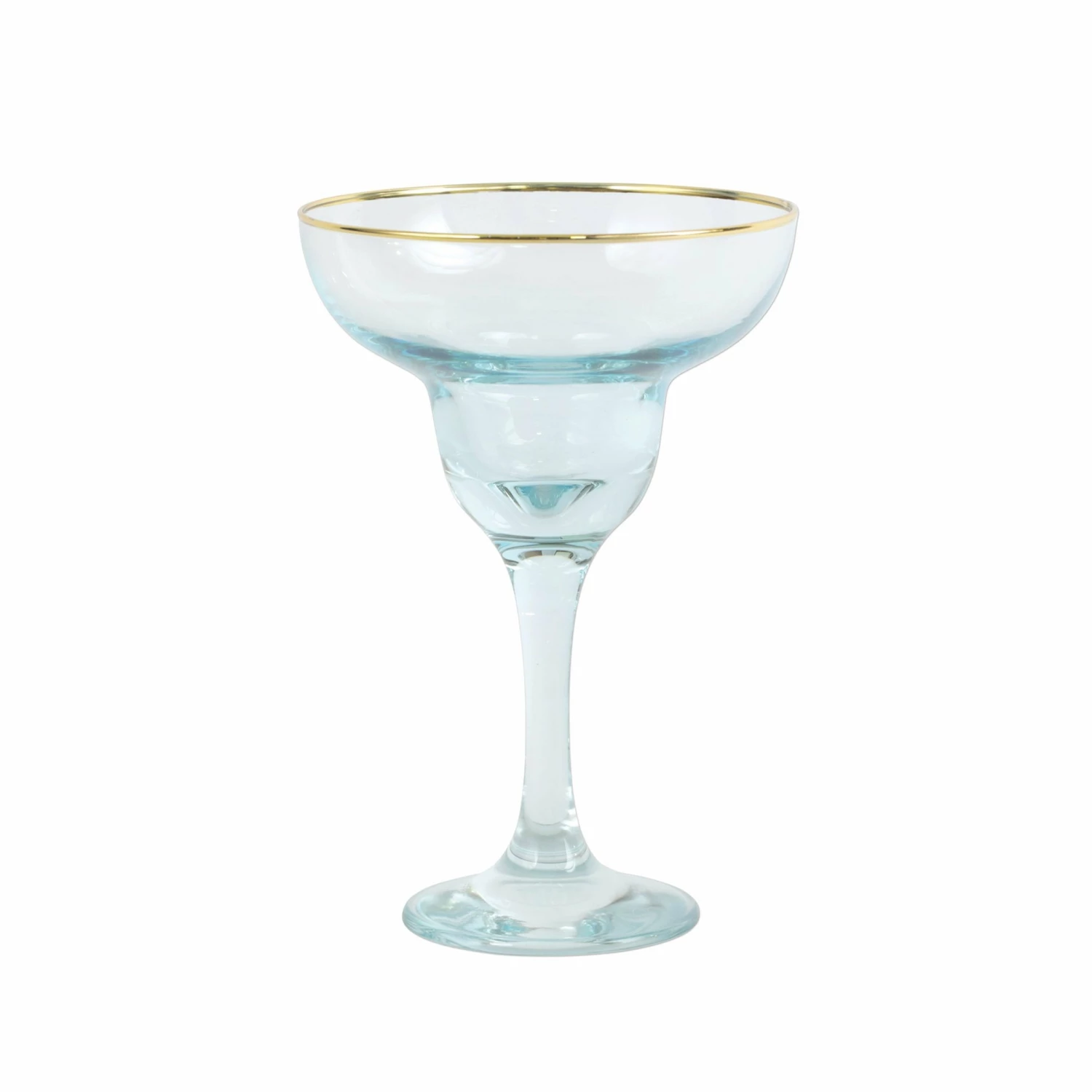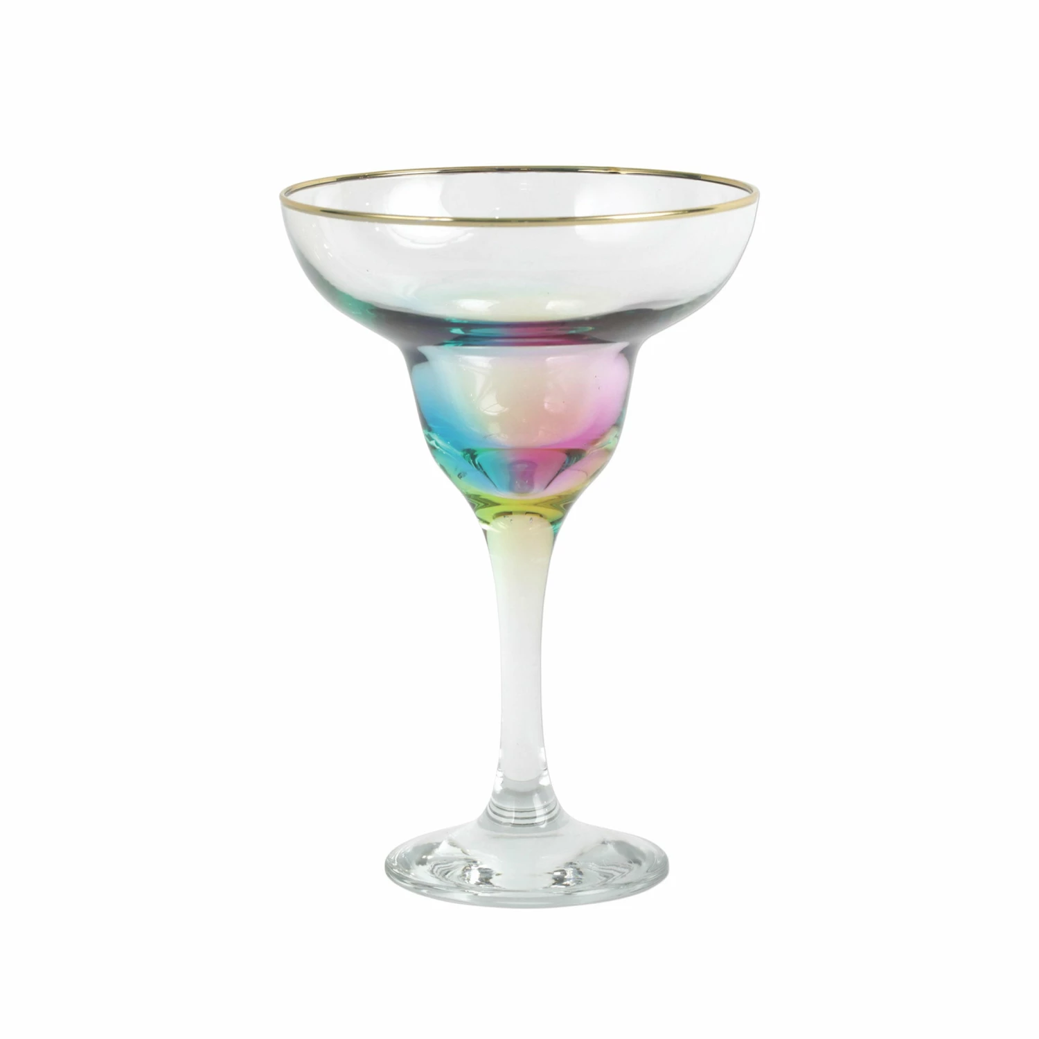 Add sparkle to any setting with a gilded gold rim and varied colored glass that refracts light on the Rainbow Margarita Glass.