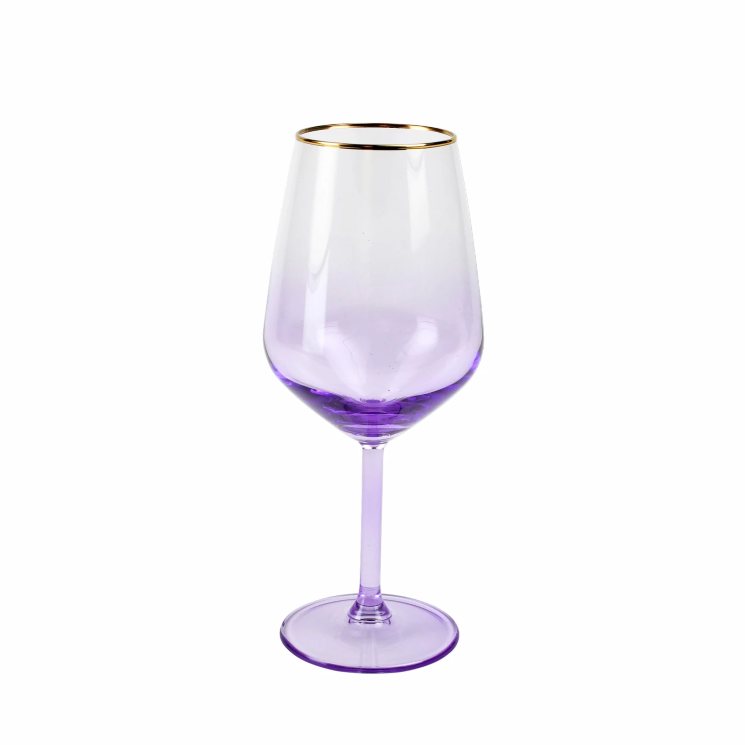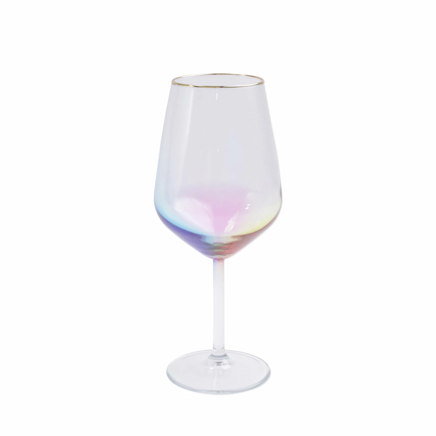 Add sparkle to any setting with a gilded gold rim and varied colored glass that refracts light on the Rainbow Wine Glass.