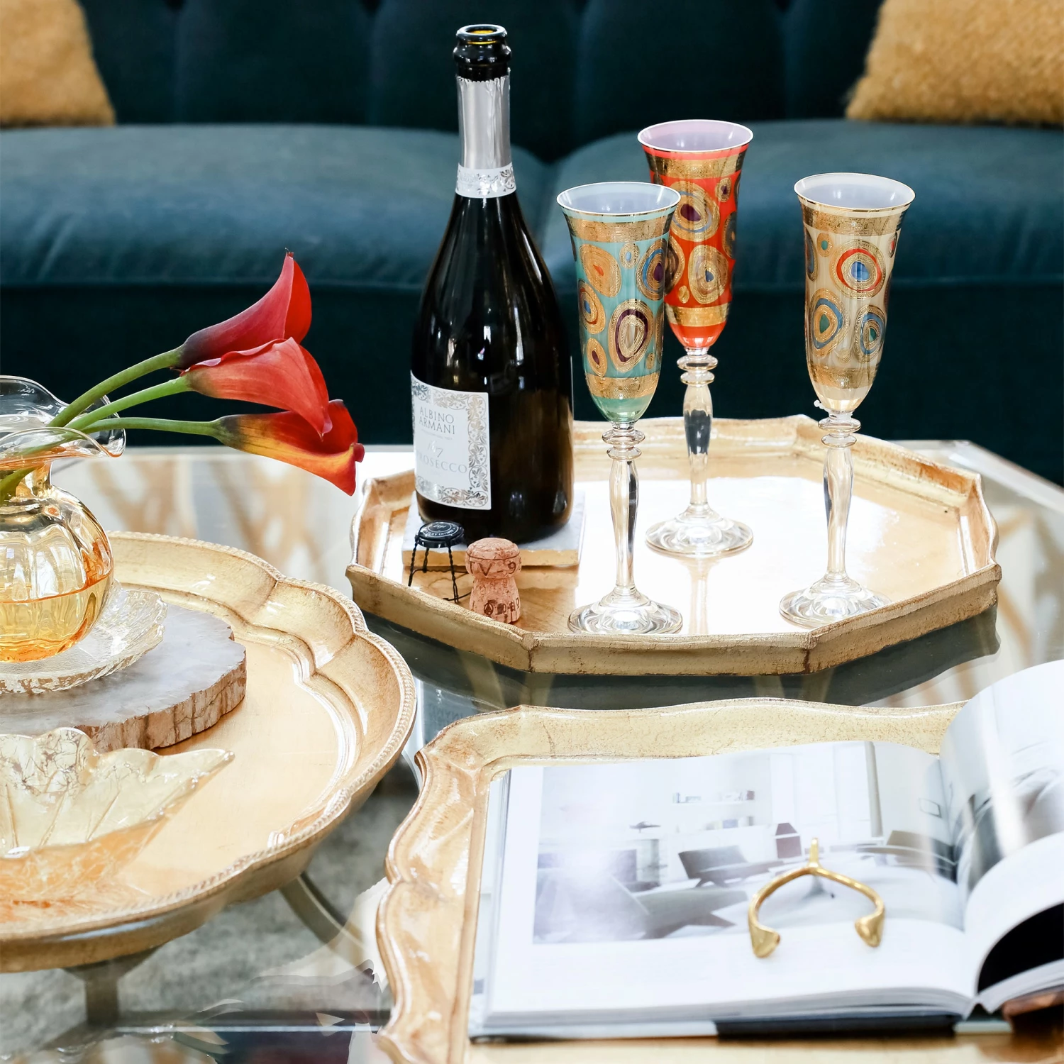 Ornate emblems and decorations that are indicative of royalty inspired this unique drinkware collection. The Regalia Cream Champagne Glass is handpainted in 14-karat gold.