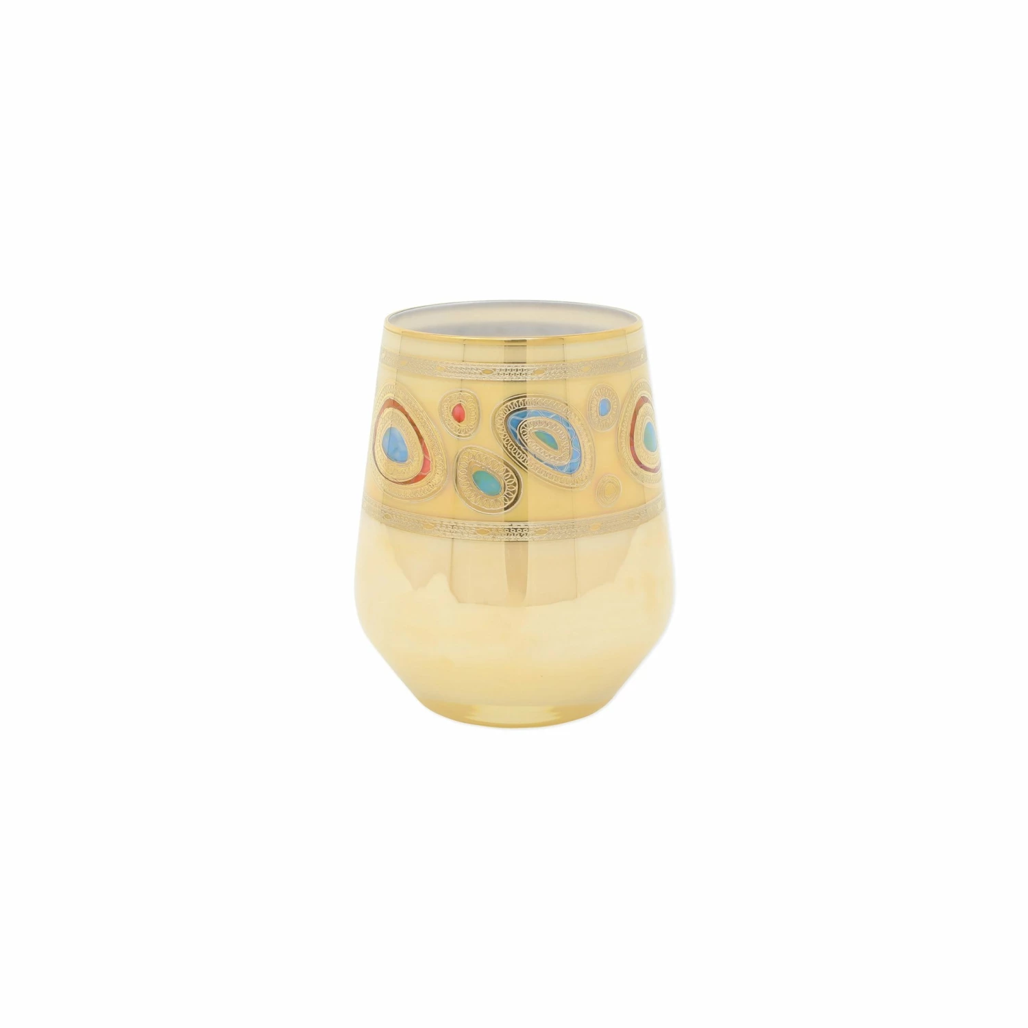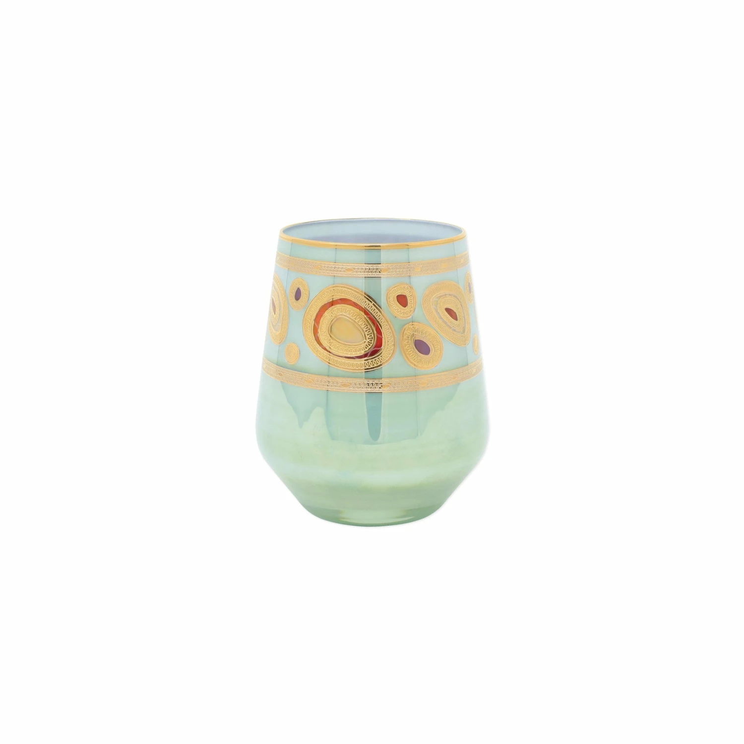 Ornate emblems and decorations that are indicative of royalty inspired this unique drinkware collection. The Regalia Cream Stemless Wine Glass is handpainted in 14-karat gold.
