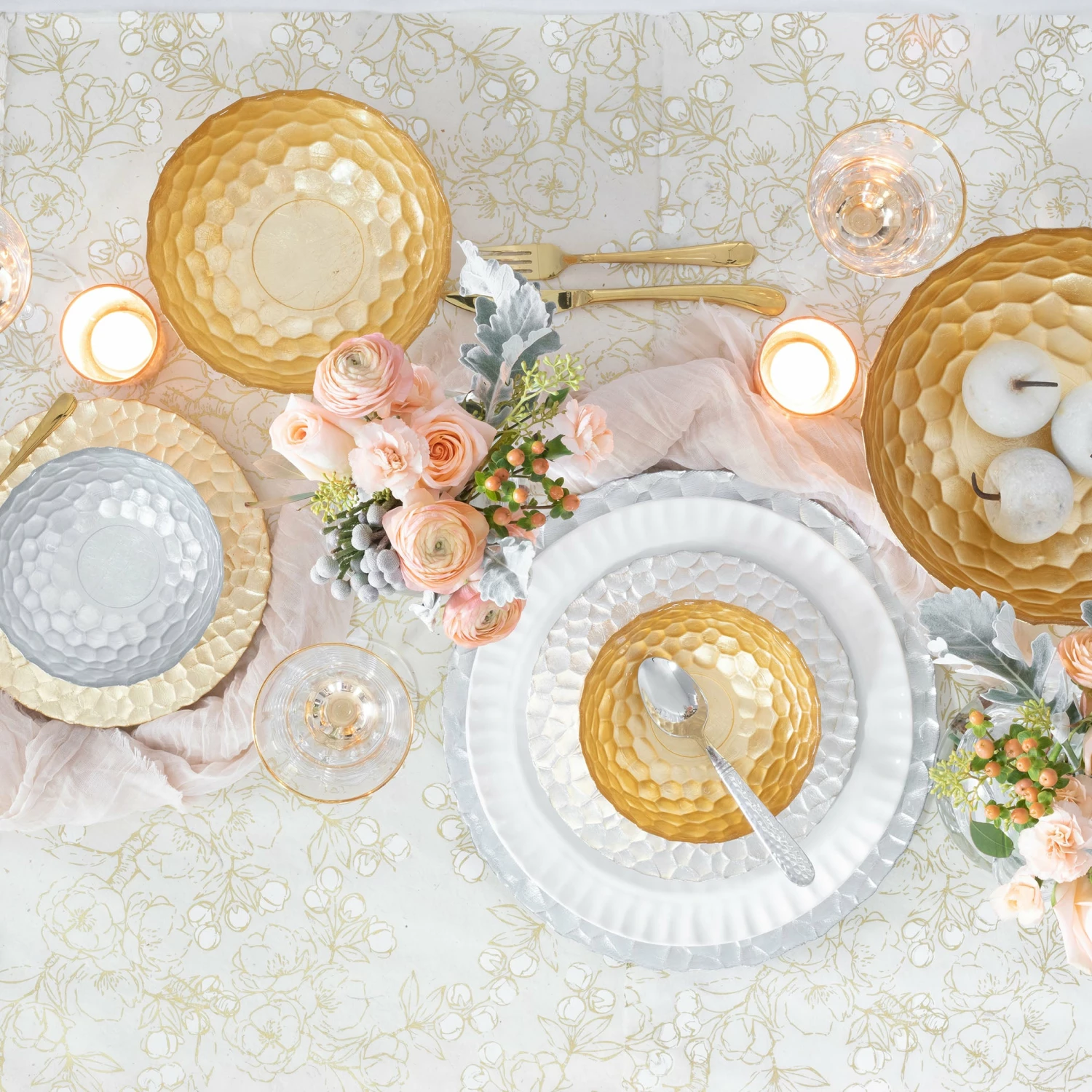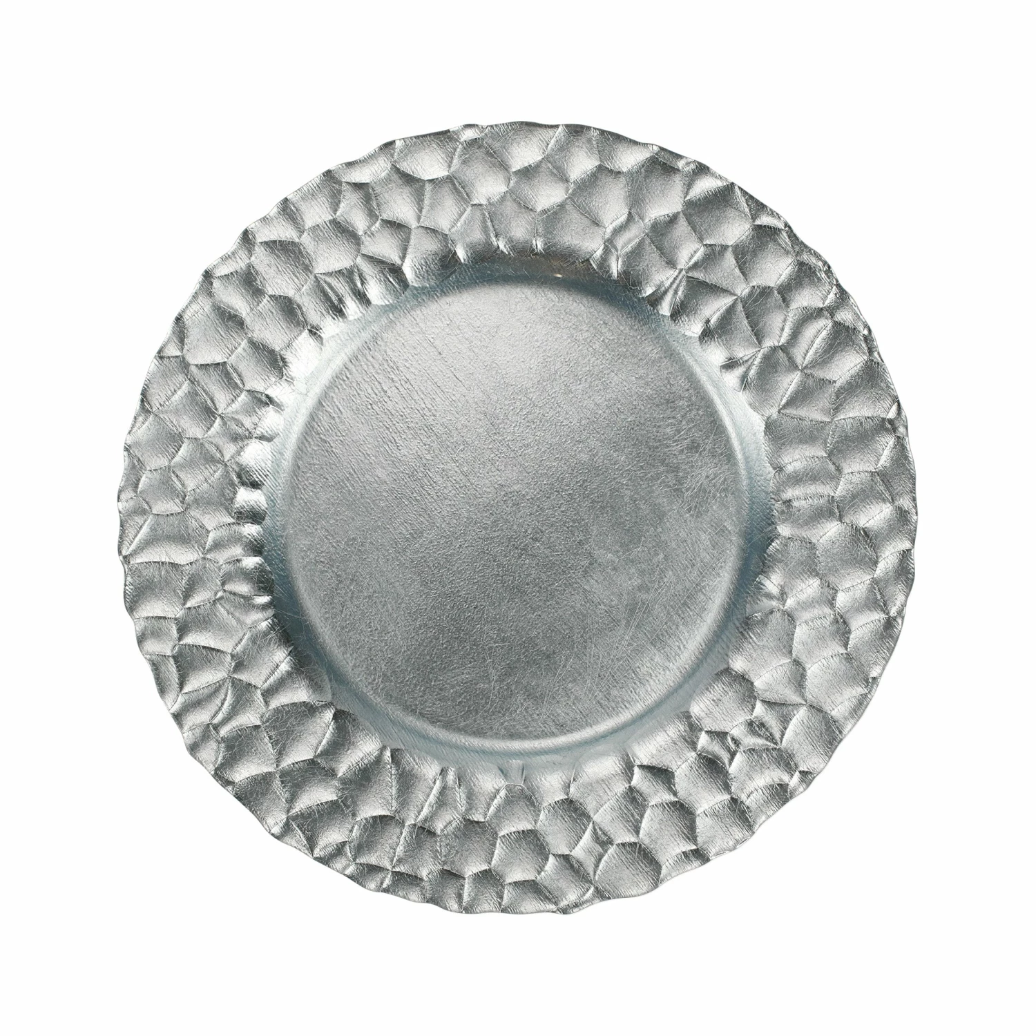 The Rufolo Glass Platinum Honeycomb Service Plate/Charger brings luster to your table. The glass piece features an organic, striking honeycomb pattern, and the final result makes a glimmering statement.